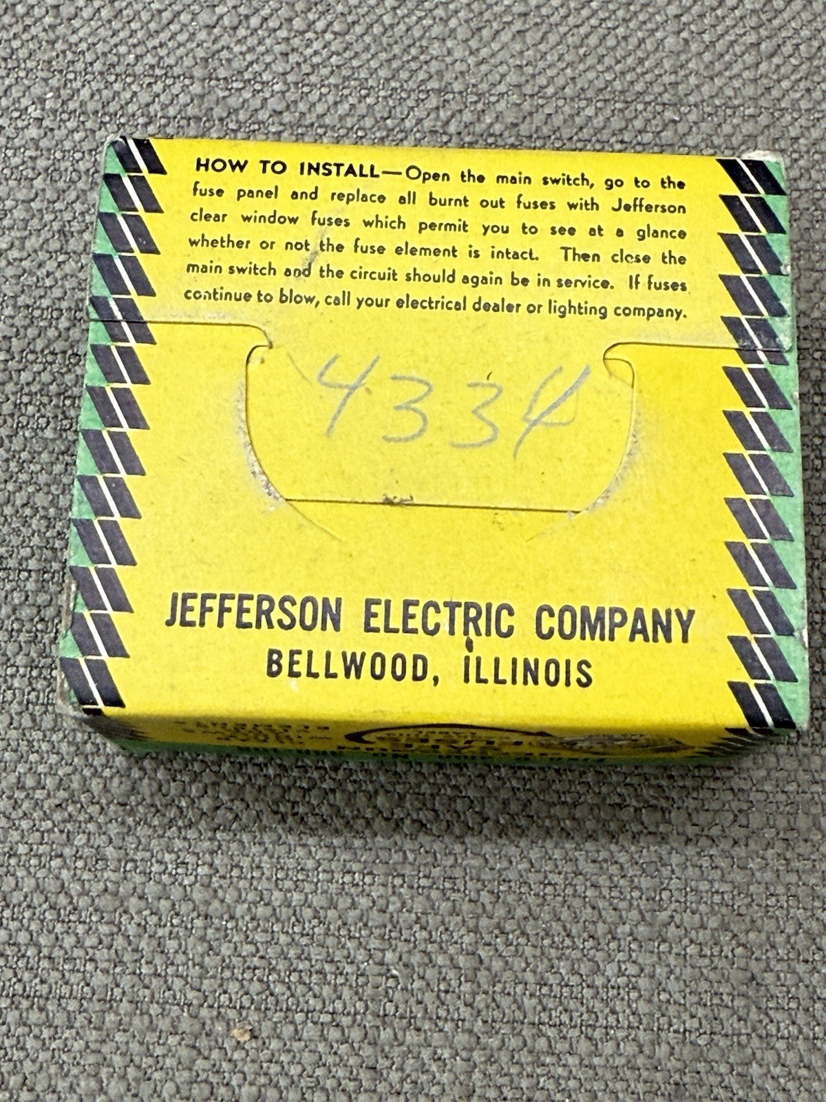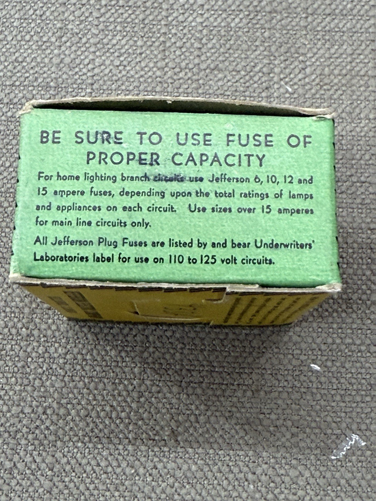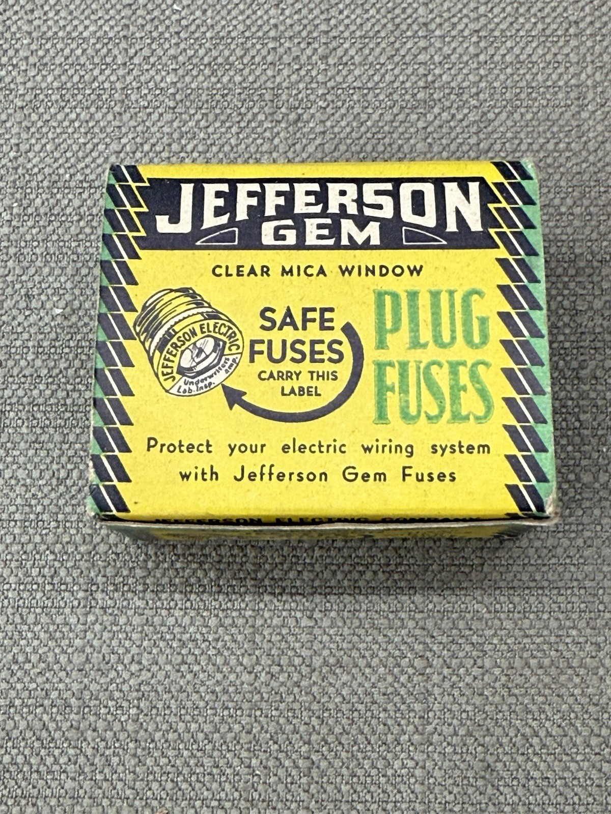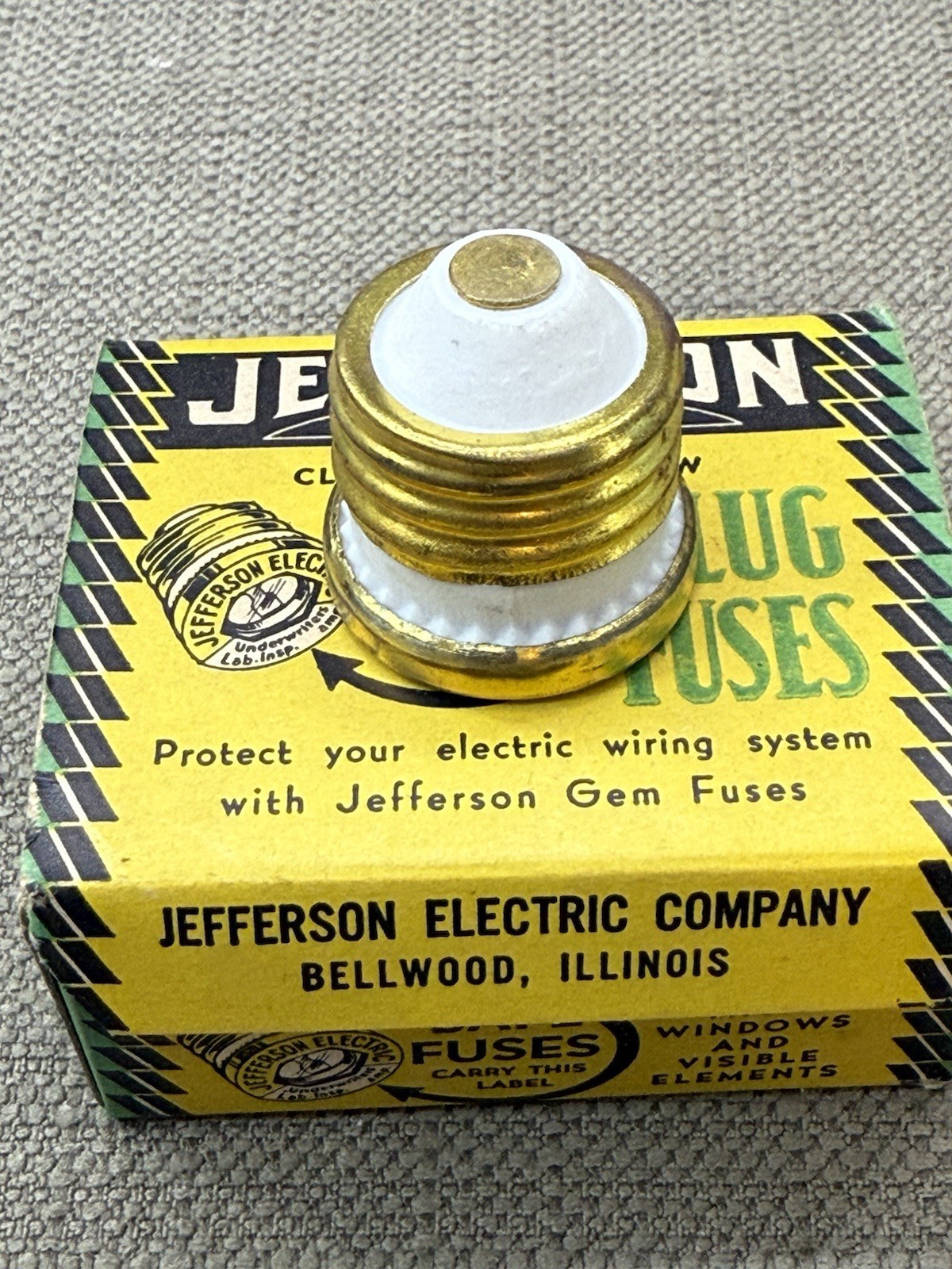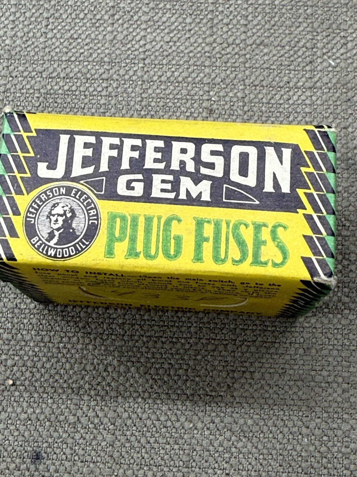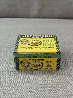 Includes five unused plug fuses in their original yellow and green Jefferson Gem packaging, with strong mid-century industrial graphics. A great collectible for vintage electrical, steampunk decor, or industrial display?or for maintaining authentic restoration setups.
