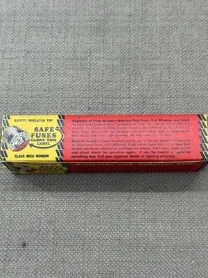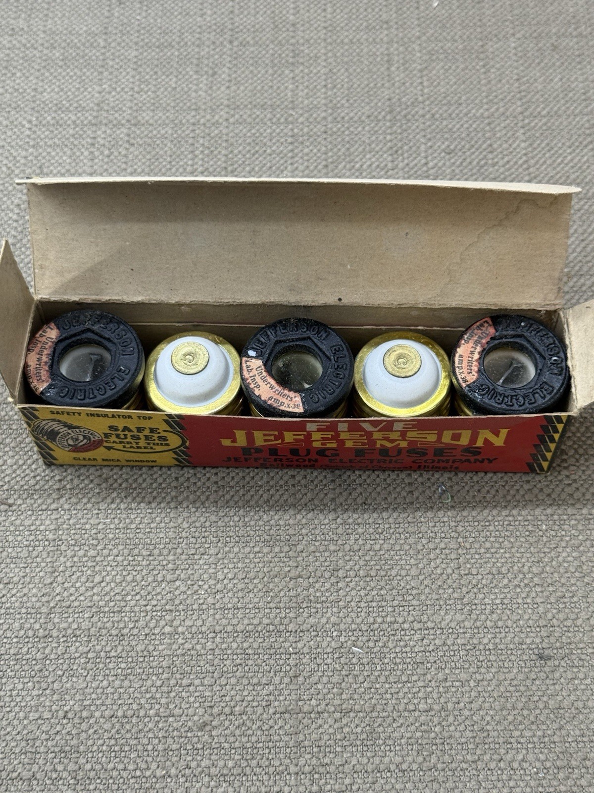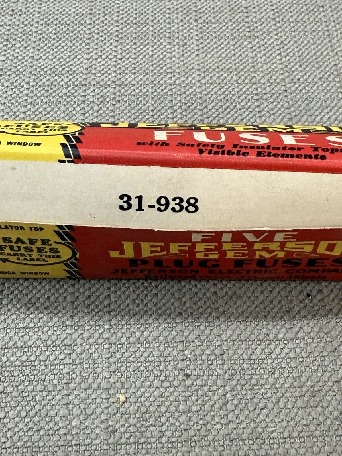 Box of Jefferson Gem 5 Amp 125 Volt plug fuses by Jefferson Electric Company, Bellwood, Illinois. Classic mid-century red, yellow, and black packaging marked ?Safe Fuses ? Clear Mica Window? with the Underwriters Lab approval label.
