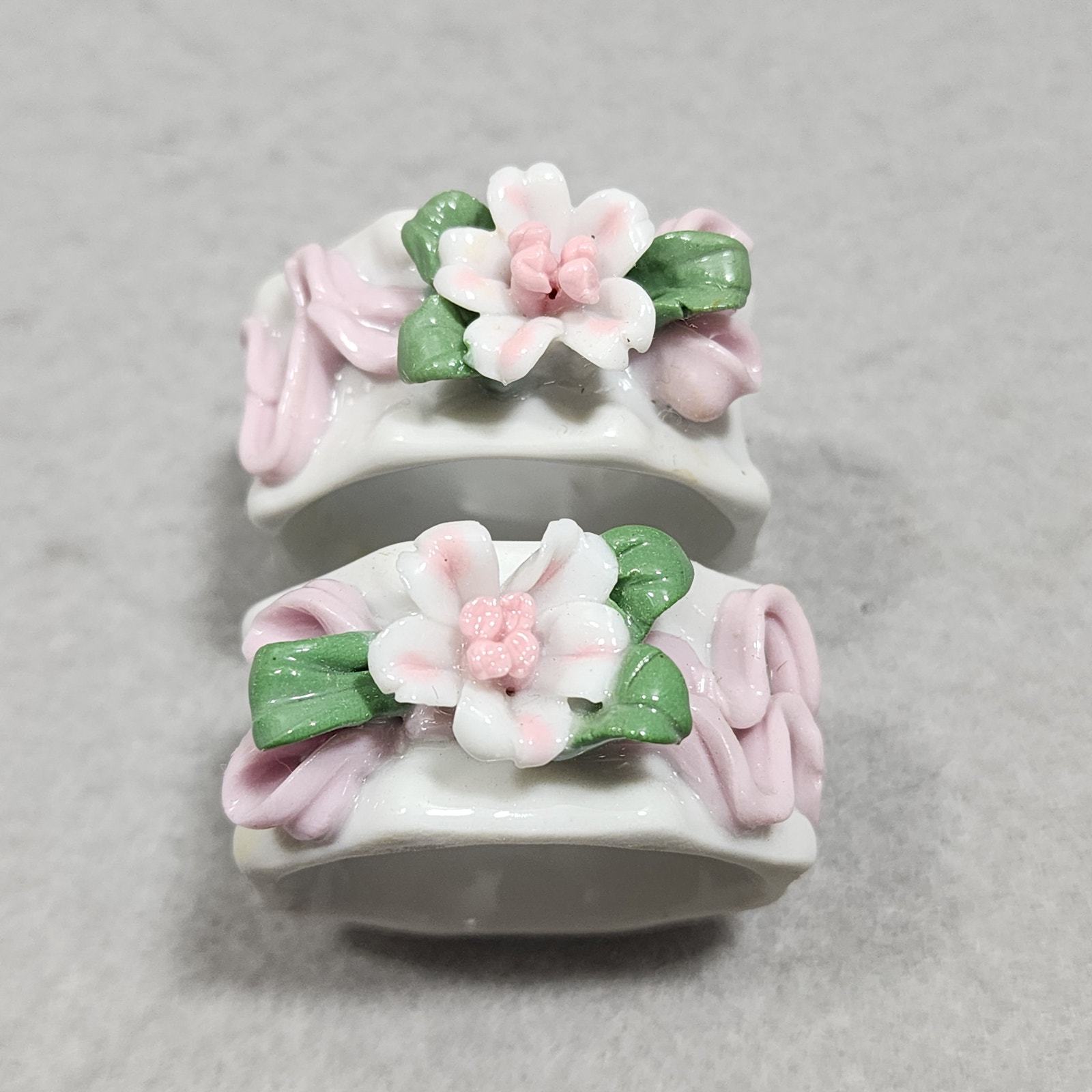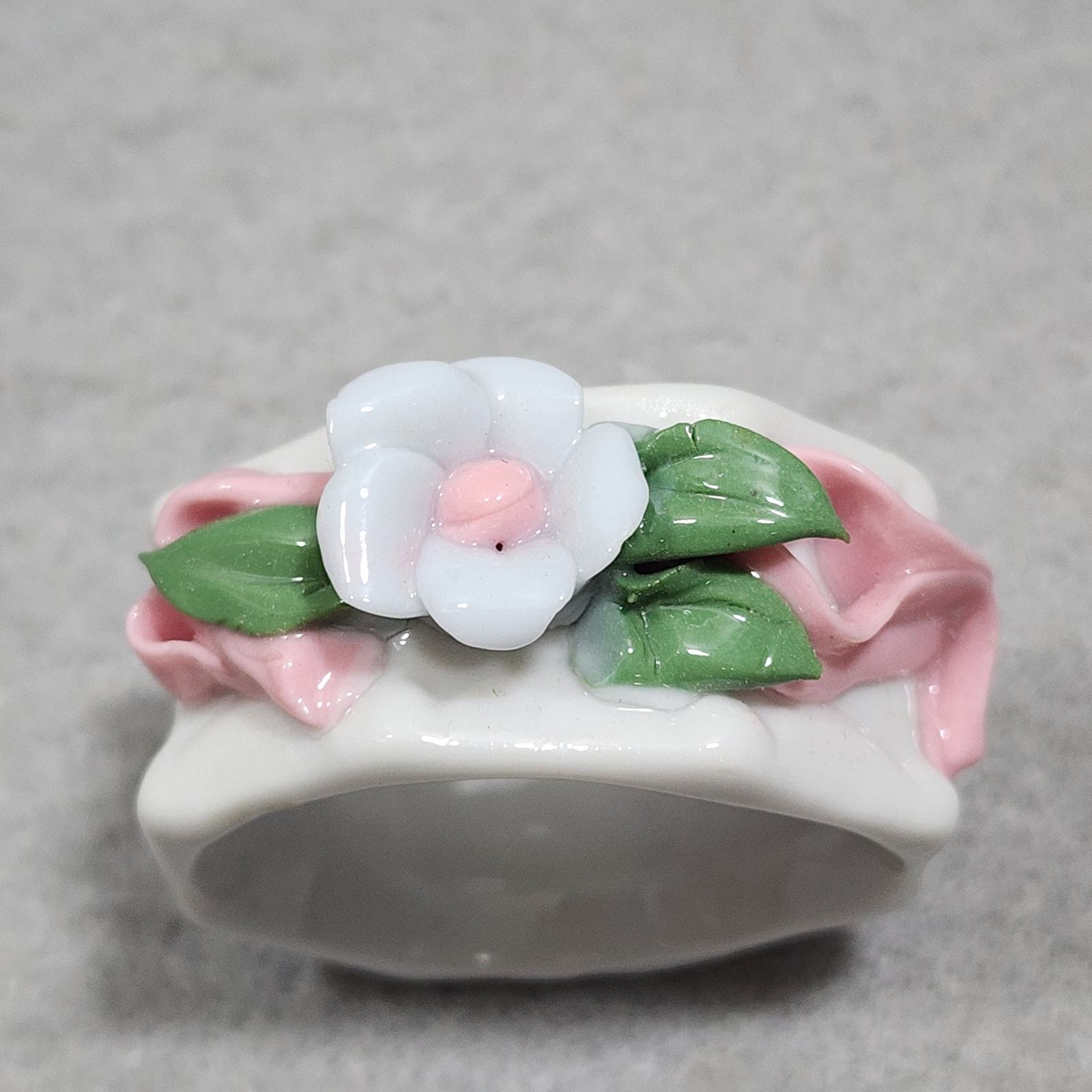 6 Porcelain 3D Floral Design Napkin Rings Cottage Chic Vintage Farmhouse Decor. Adds a decorative accent to any dinner entertainment table
