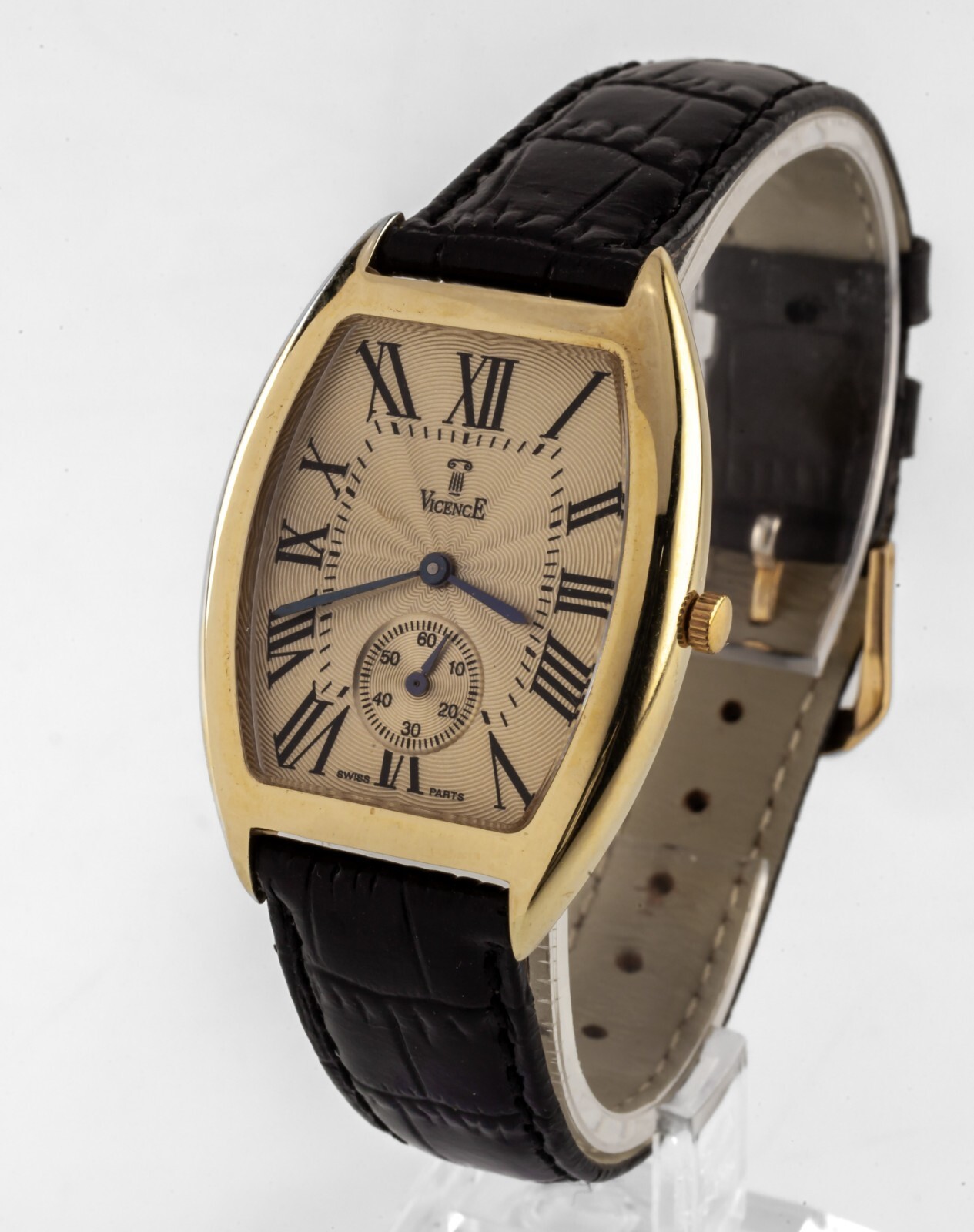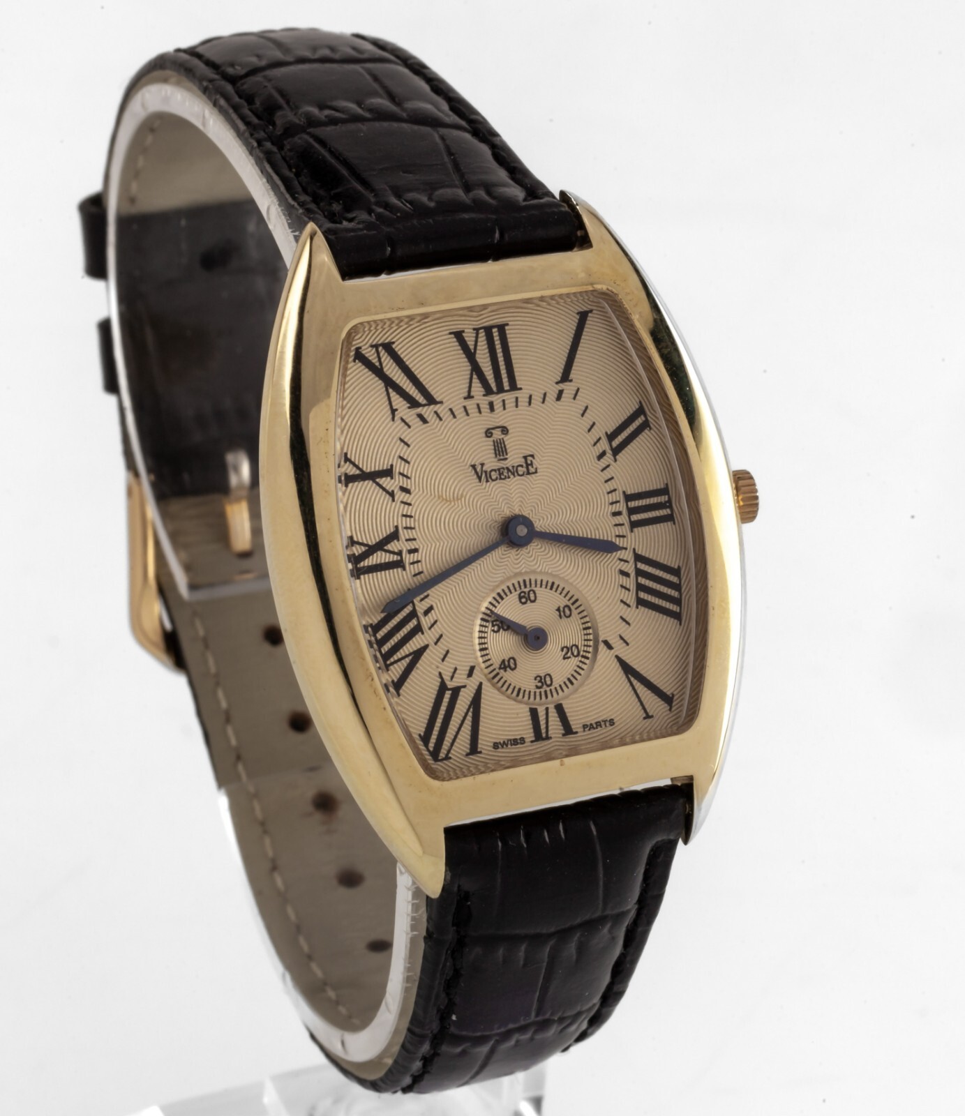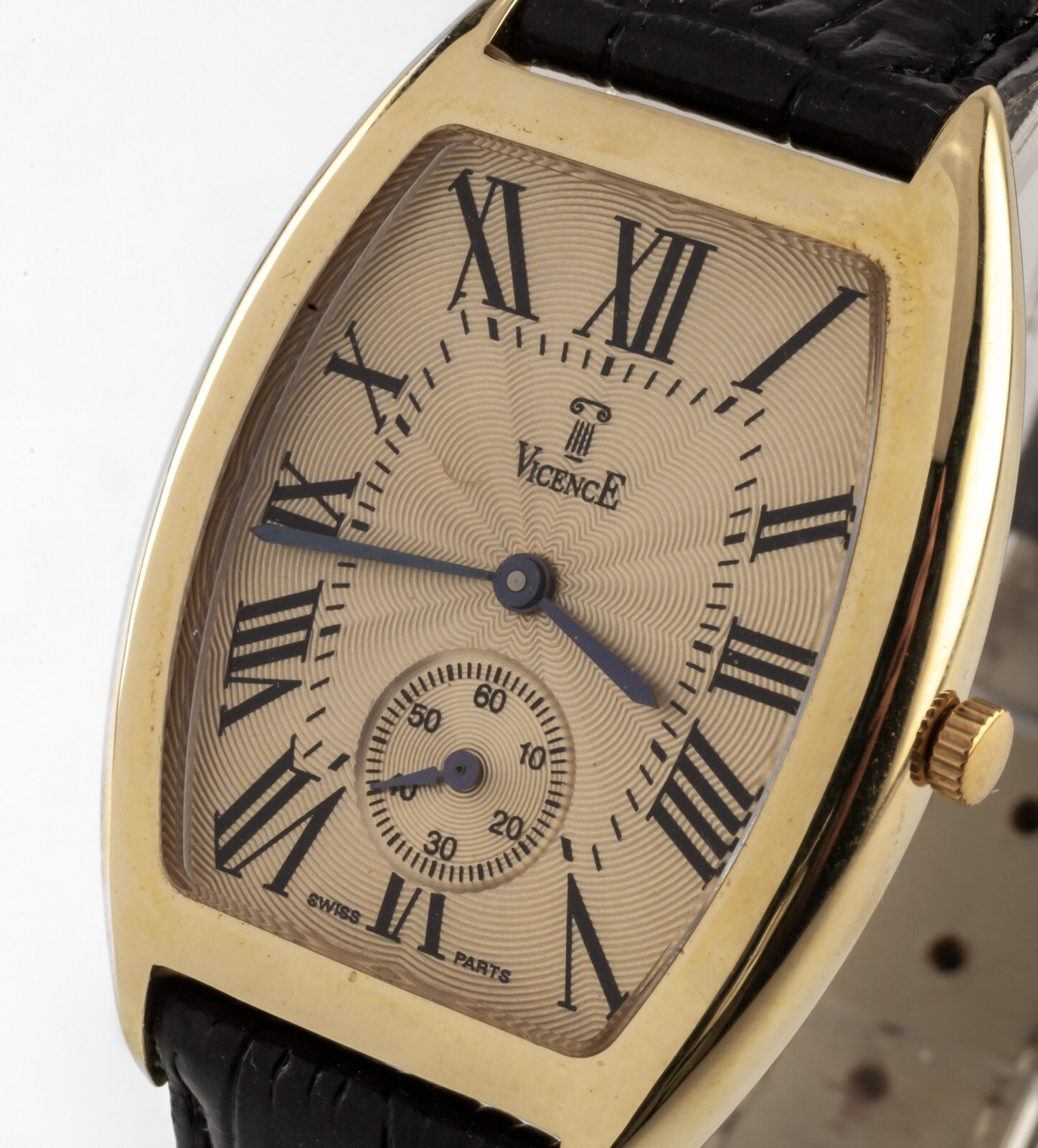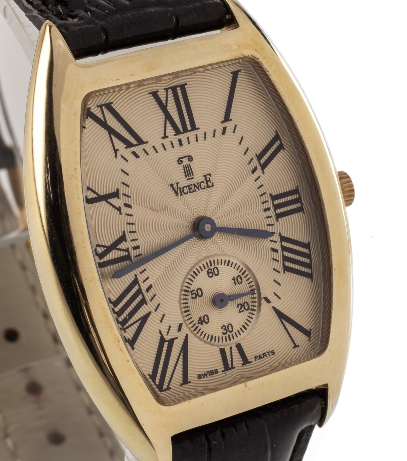 Vicence 14k Oro Amarillo Tonneau Mujer Reloj W/ Guilloche Dial Y Correa Piel