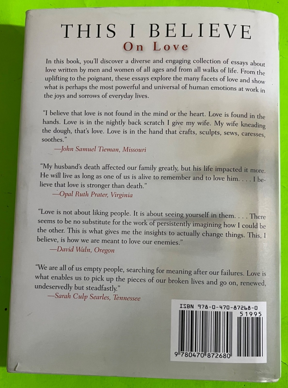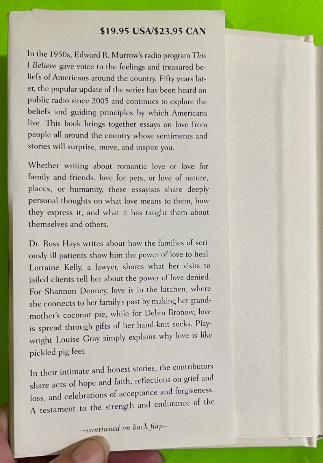 In the 1950's, Edward R. Murrow's radio program, This I Believe, gave voice to the feelings and treasured beliefs of Americans around the country. Fifty years later, the popular update of the series, which now continues on Bob Edwards Weekend on public radio, explores the beliefs that people hold dear today. This book brings together essays on love from ordinary people far and wide whose sentiments and stories will surprise, inspire, and move you.