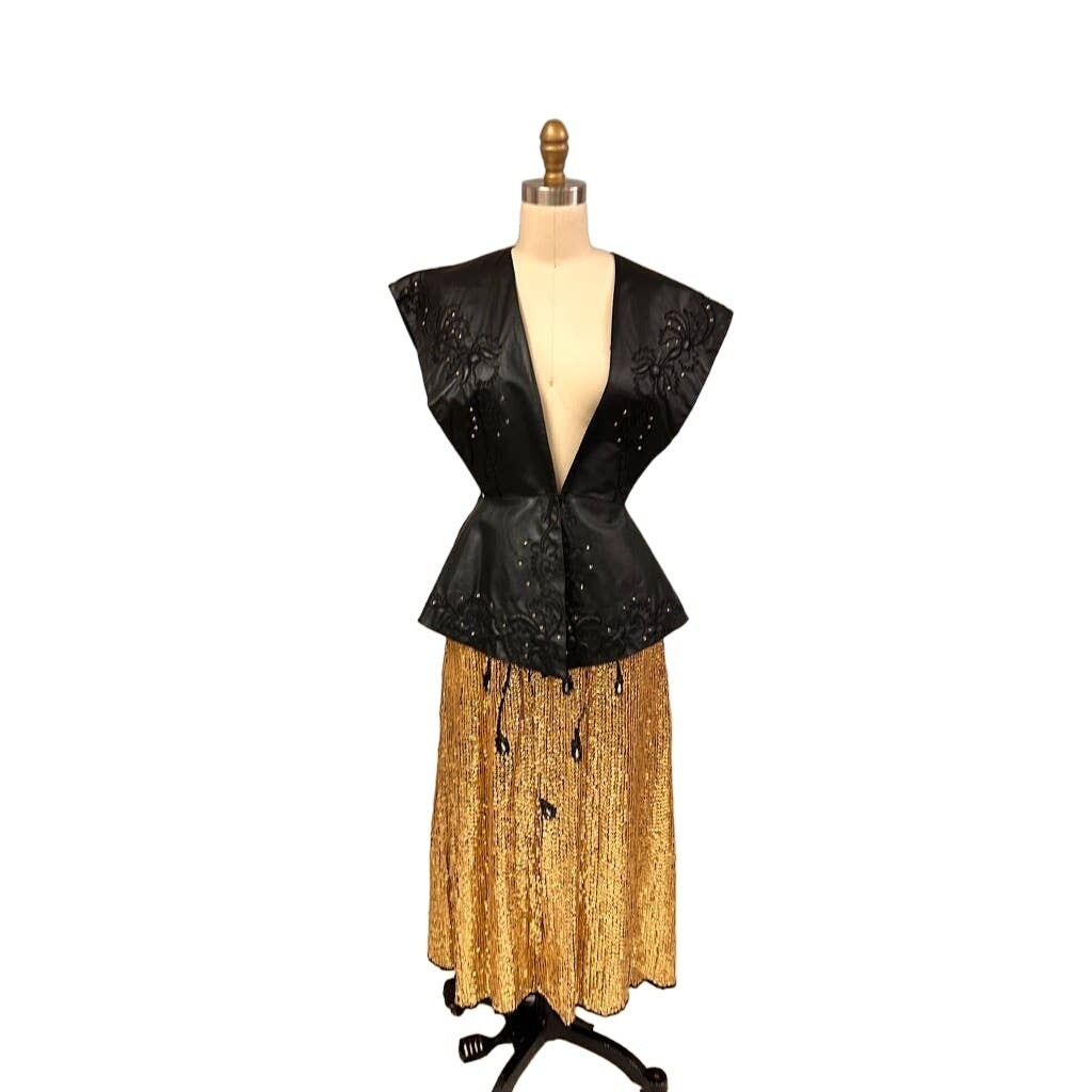 Vintage 1980s sequined party skirt in shimmering gold with an Art Deco?inspired beaded ?peacock feather? motif. Features an elastic waist, pull-on style, and full lining. Glamorous yet easy to wear, perfect for cocktail parties or evening events.