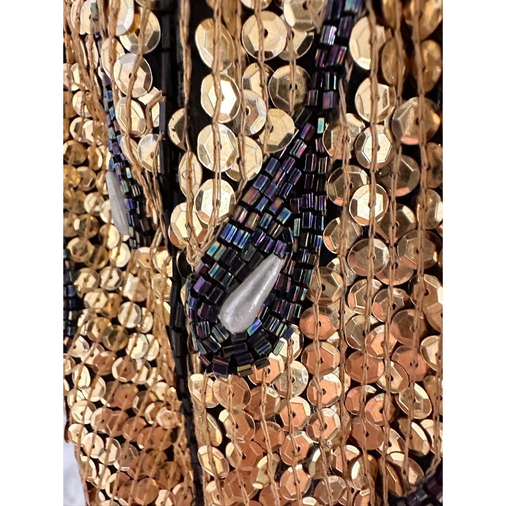 Gold sequins, beads in peacock feather motif, elastic waistband, lined interior.