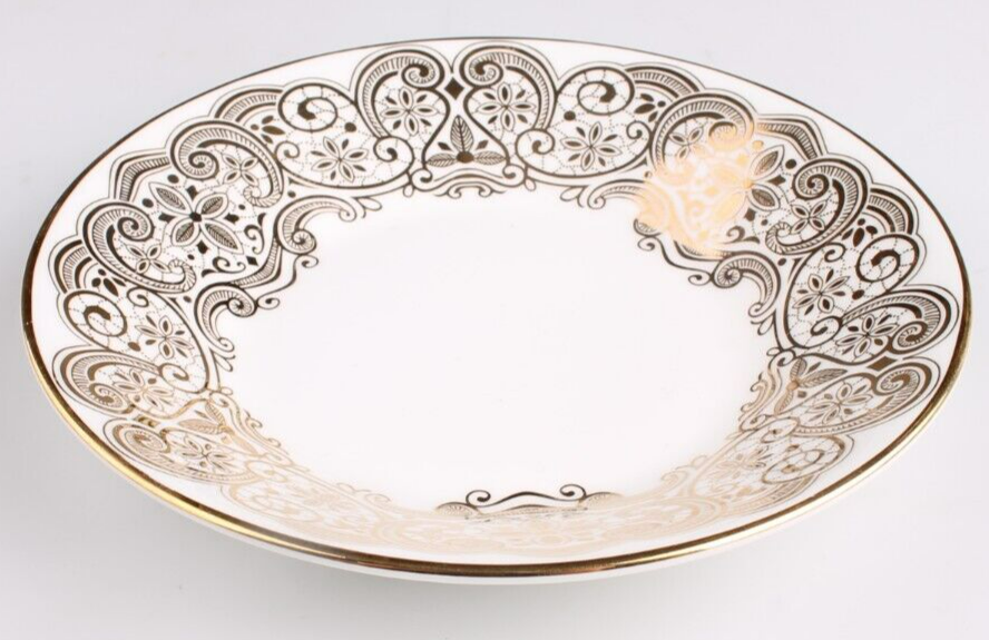Elevate your table setting with the exquisite Lismore Lace Gold saucer, a retired piece by the renowned Waterford. Brand New with Tags! Crafted in Ireland, this 5.5-inch bone China saucer features a stunning gold lace design that brings a touch of elegance to any occasion, be it a bridal shower, anniversary, birthday, or adult milestone. The saucer's round shape and dishwasher-safe material make it as practical as it is sophisticated. Its originality is assured, as it bears the distinguished Waterford printed backstamp. Whether you're looking to add to your collection or seeking a special gift, this saucer is a timeless choice that celebrates love and romance.