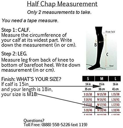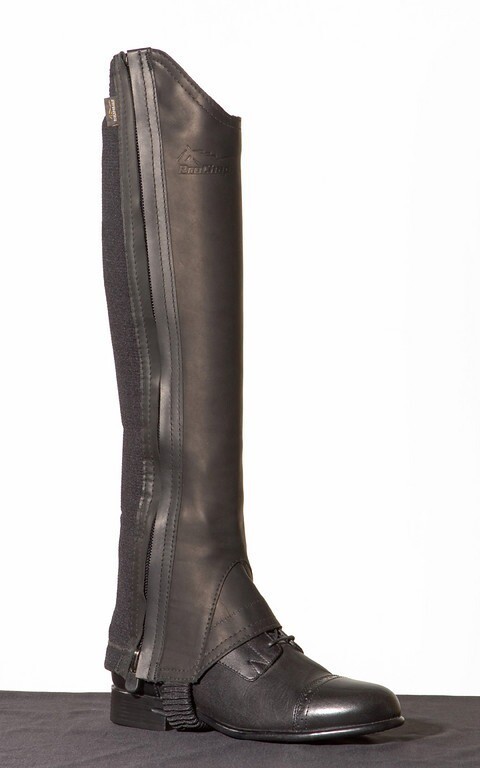 Half chap with full-length easy side zip. Waterproof buttery soft leather with Cambrelle ? lining and ProChaps 3-layered fabric incorporating an ultra-lightweight Airprene ? stretch panel for superior flexibility, stability, breathability and comfort. Custom-like fit. Anti-ammonia galvanized straps under the boots and ultra-resistant in-lock zipper that locks into place. Wide spectrum of sizes in black and brown.