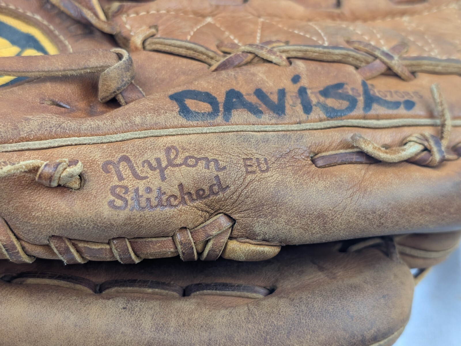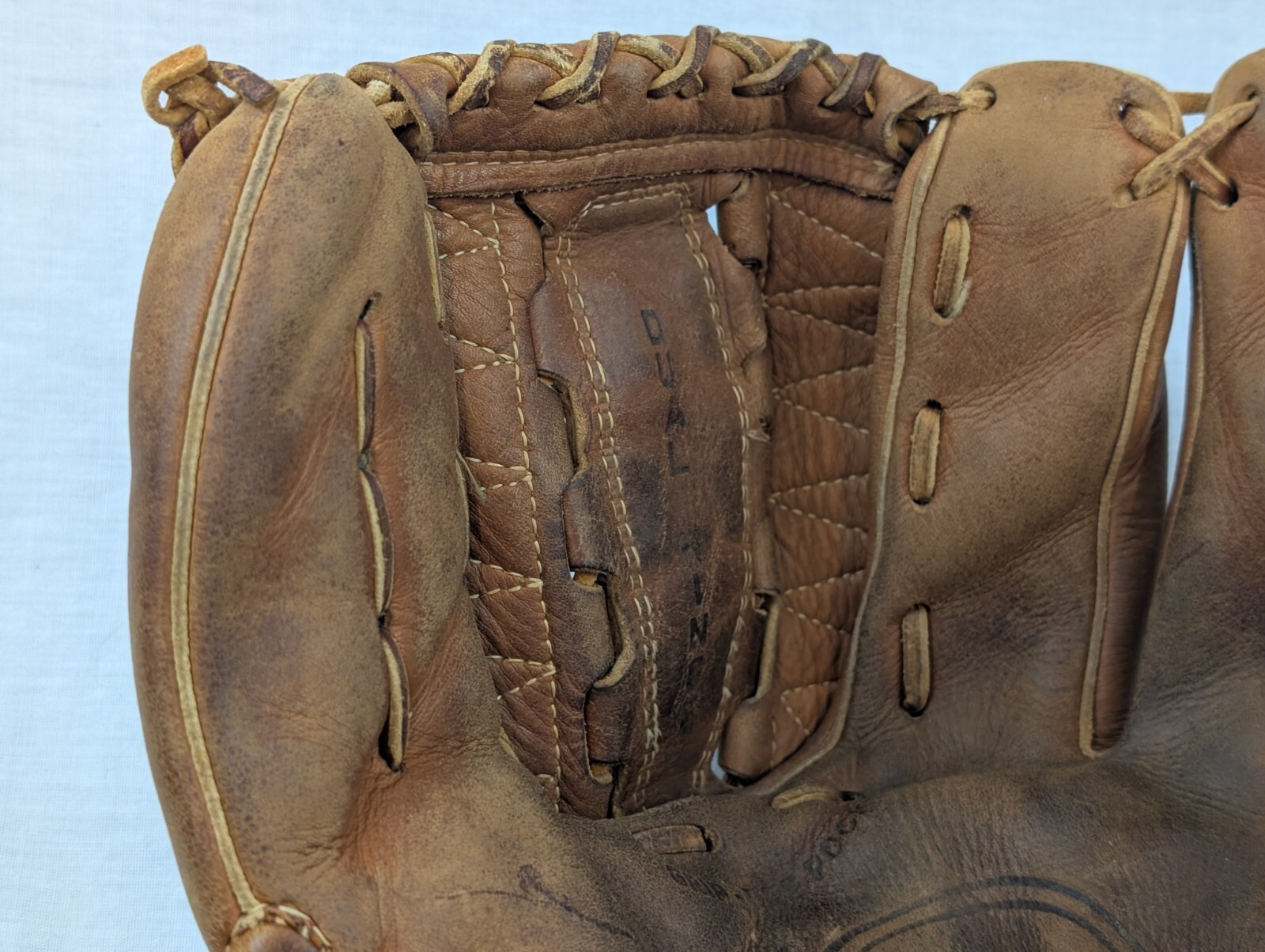Has previous owner's name written in black marker on it. All the stiching is in decent condition, especially for glove that's more than 40 years old! Certainly well broken in!