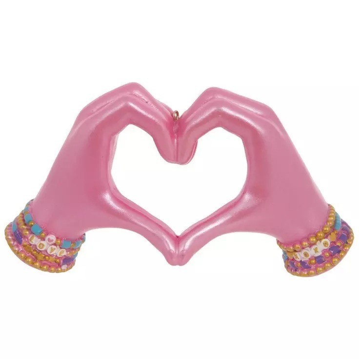 Decorate your Christmas tree in a style you love with this Pink Heart Hands Ornament! This cute resin ornament features two hands making a heart symbol. Each wrist is decorated with beaded bracelets, including alphabet beads that spell out "Love" and "XOXO." Hang it up by its gold string, and pair it with other pretty pink ornaments for a chic Christmas display.