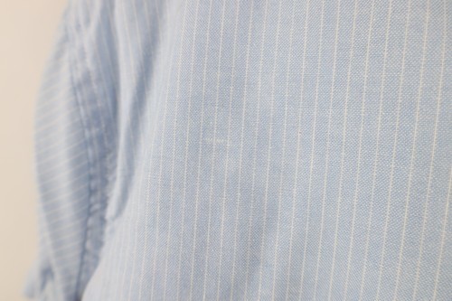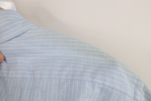 Stains front top left. Thread bare spots back. Loose threads bottom hem. Collar, armpits discolored. Color faded. Pilling. Made in USA