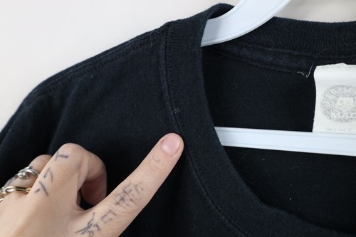 Stains front, collar. Loose threads collar. Dark spots, pilling. Collar, arms discolored. Graphics, color faded