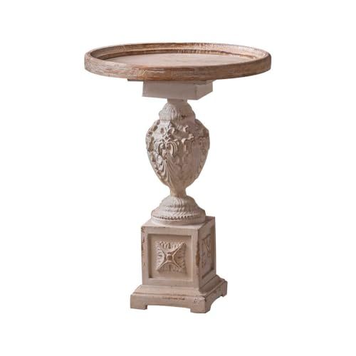 Product description: Elevate your living space with this exquisite Vintage White Round Side Table by Interoknack. The beautifully crafted piece features an ornate carved pedestal base that exudes timeless elegance and European charm. With its generous 18.1-inch diameter tabletop and 24.8-inch height, this versatile accent table provides ample space for displaying decorative items, serving beverages, or holding everyday essentials. The meticulously distressed white finish adds character and sophistication to any room setting. Crafted from durable wood and resin materials, this table combines sturdy construction with artistic detailing that makes it a stunning focal point. Whether placed in your living room, bedroom, dining area, or commercial space, this retro pedestal table seamlessly blends with vintage-inspired, shabby chic, or luxury decor styles. Its classic French design and functional beauty make it an ideal addition for those seeking to create a refined atmosphere with a touch of nostalgic charm.