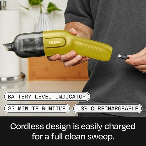 The BUFF Cordless Handheld Vacuum (BF02-YELLOW) is a compact, rechargeable vacuum cleaner designed for versatile use?ideal for home, office, car interiors, and pet hair cleanups. It?s lightweight, cordless, and comes with attachments that make it easy to reach tight spaces.