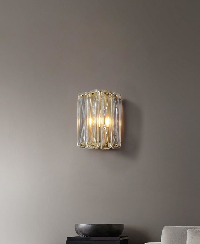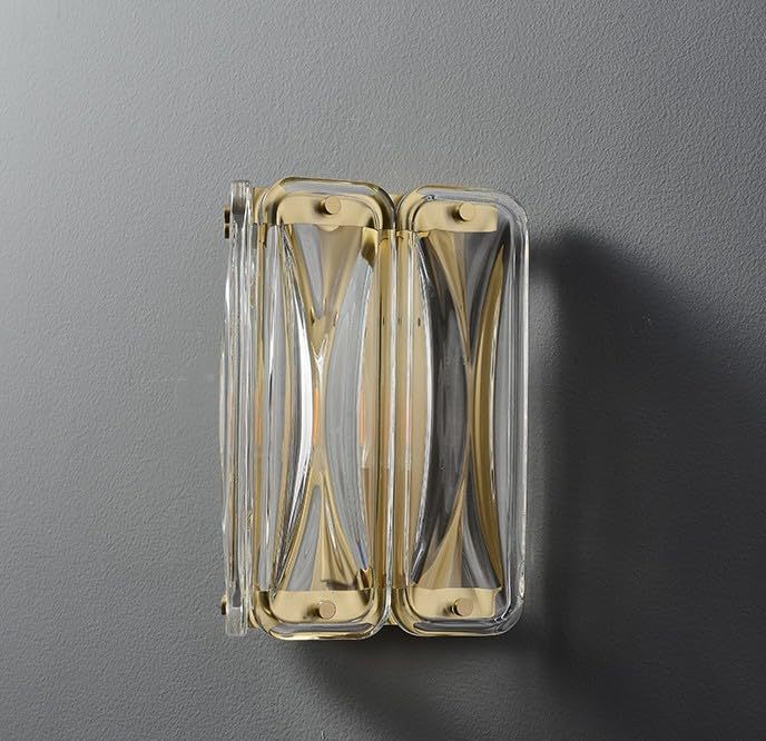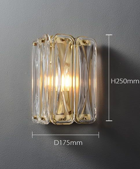 Product description: Elevate your interior design with this Modern Luxury Brass and Crystal Glass Wall Sconce by Interoknack. This sophisticated lighting fixture combines a sculpted brass frame with faceted crystal glass, creating a stunning visual accent for any room. Measuring 6.9 inches wide, 9.8 inches high, and projecting 4.7 inches from the wall, this compact sconce is perfectly proportioned for bedside illumination, hallway enhancement, or living room accent lighting. The single-layer design provides neutral, glare-free LED lighting through its E14 socket, effectively illuminating spaces between 86-108 square feet. The premium materials ensure durability and easy maintenance, making this fixture suitable for both residential homes and upscale hospitality settings. The timeless silhouette of this wall lamp complements various interior styles including mid-century, modern, and luxury decor themes. Its brass and crystal glass construction offers lasting beauty while providing functional illumination that transforms the ambiance of any space it adorns.