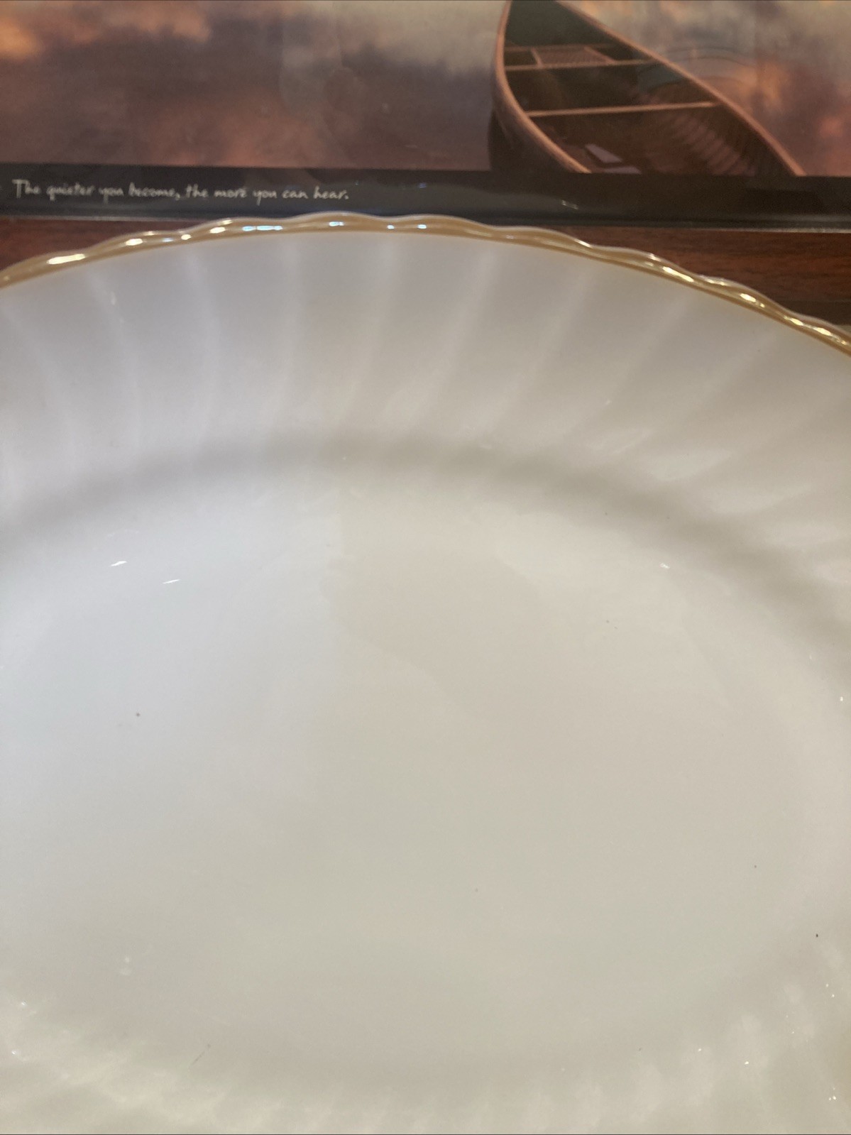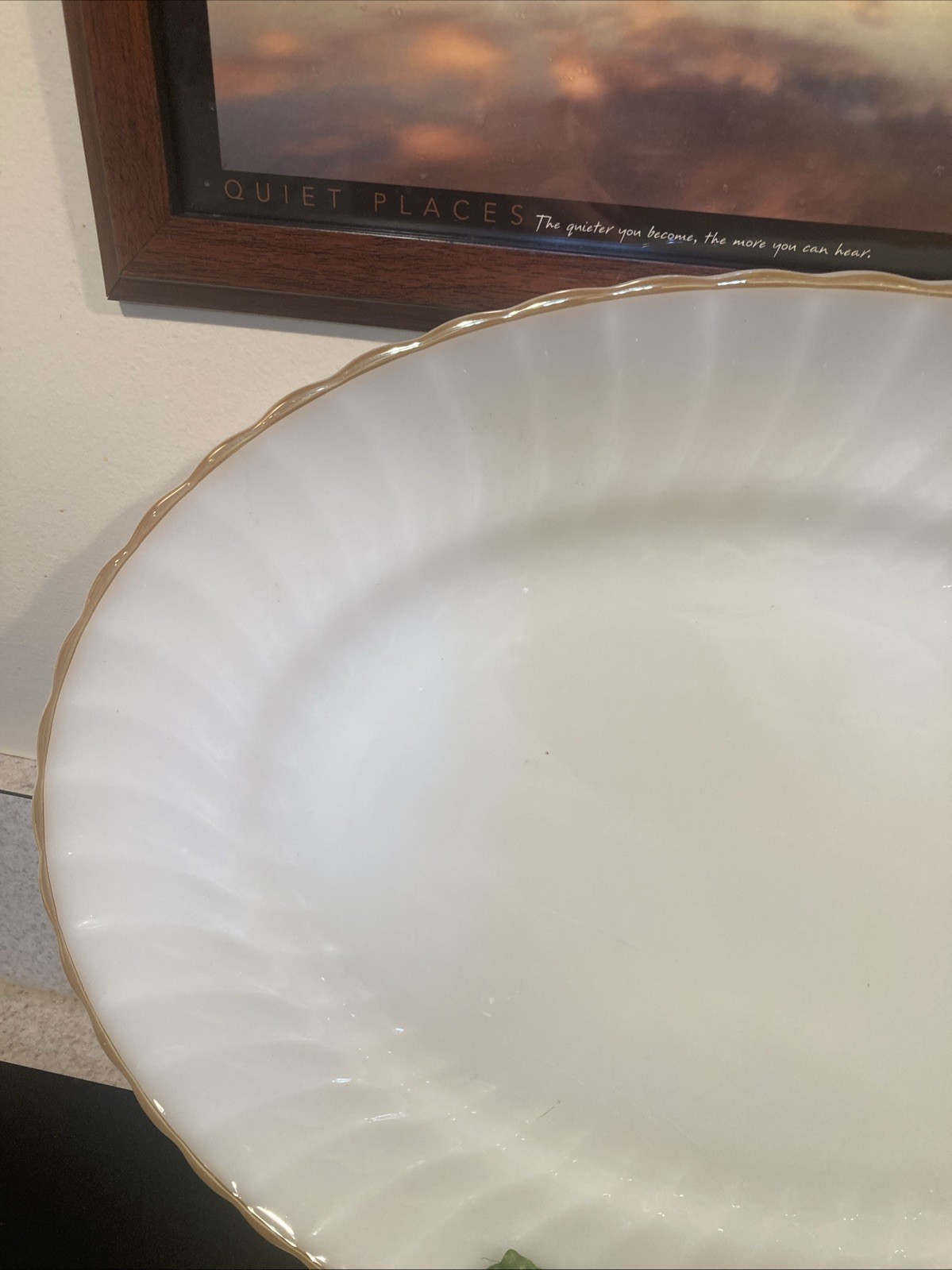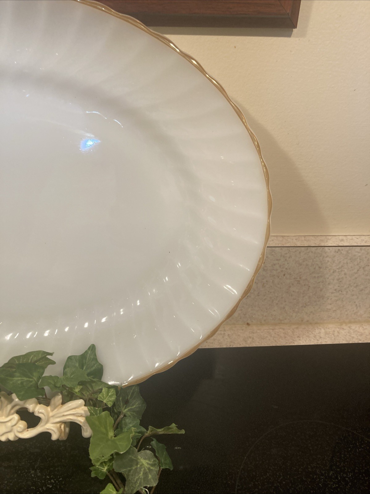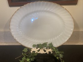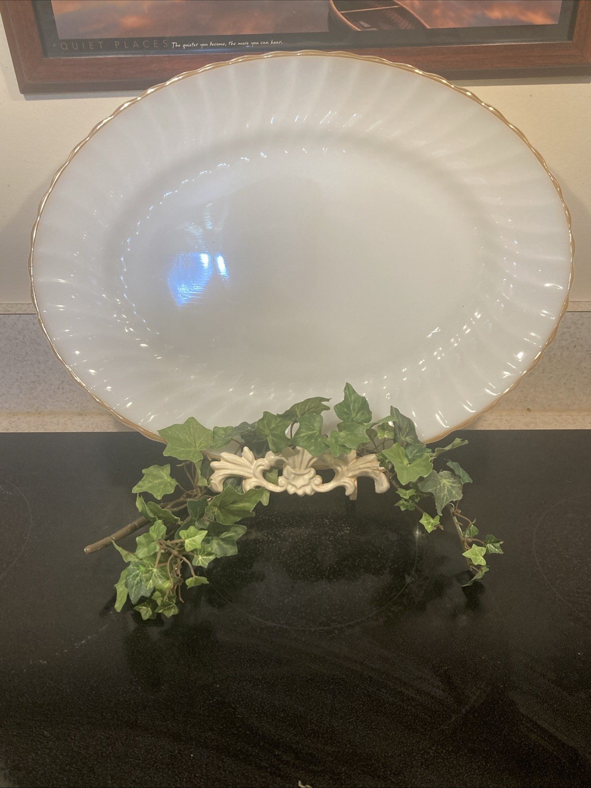 The Anchor Hocking Fire King Swirl Golden Gold Shell Lustre 15.5" Serving Platter is a vintage piece of decorative cookware made of milk glass. The platter features a classic white swirl pattern with a golden gold shell lustre, adding a touch of elegance to any dining table or kitchen decor. Produced by Anchor Hocking in the United States, this oval-shaped platter is a part of the Fire-King product line, known for its high-quality and stylish dinnerware items. Ideal for serving a variety of dishes, this serving platter is a beautiful and practical addition to any home.