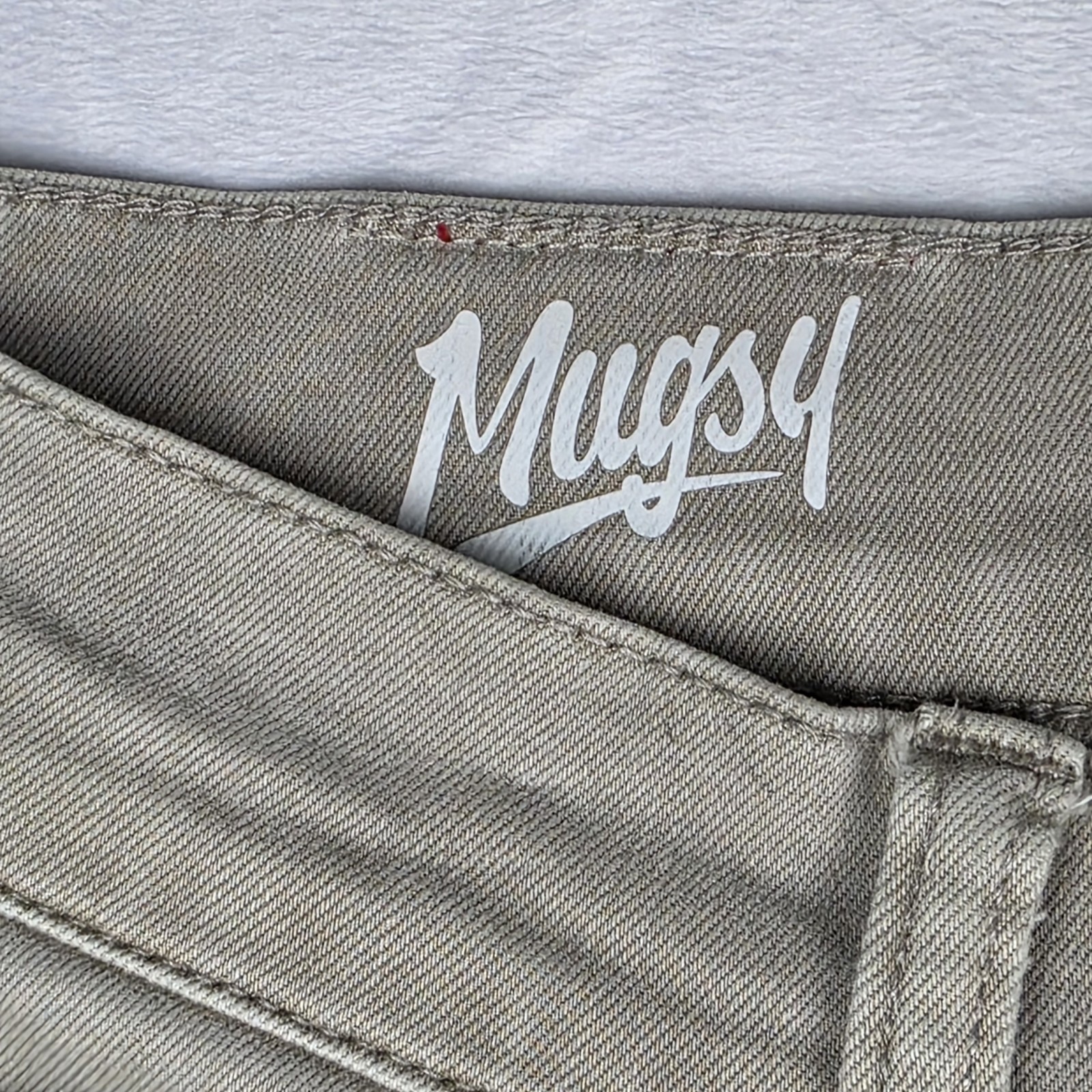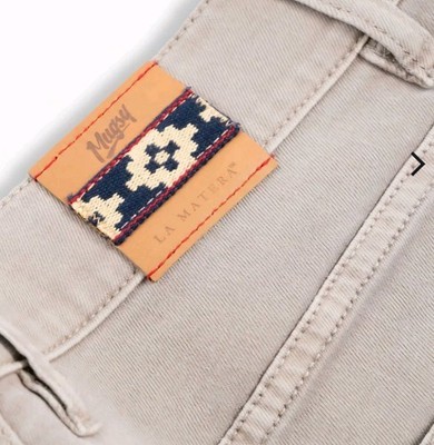 The product is a limited edition pair of Mugsy x La Matera Bucks Jeans in tan khaki beige color. Made from a cotton blend fabric with a light wash, these jeans feature a solid pattern and a mid-rise fit. The jeans have a zip and button closure, a 5-pocket design including a coin pocket, and are machine washable for easy care. The design is accented with embroidered logo details, offering a comfortable and stylish option for men looking for a versatile addition to their wardrobe.