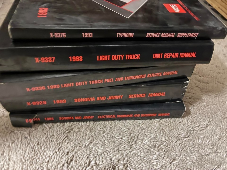 FACTORY 1993 GMC Sonoma/Jimmy Service Manual,Electrical Diagnosis and Diagrams Manual, Typhoon Supplement, Light Duty Truck Fuel and Emissions Repair Manual, and the Light Duty Truck Unit Repair Manual.