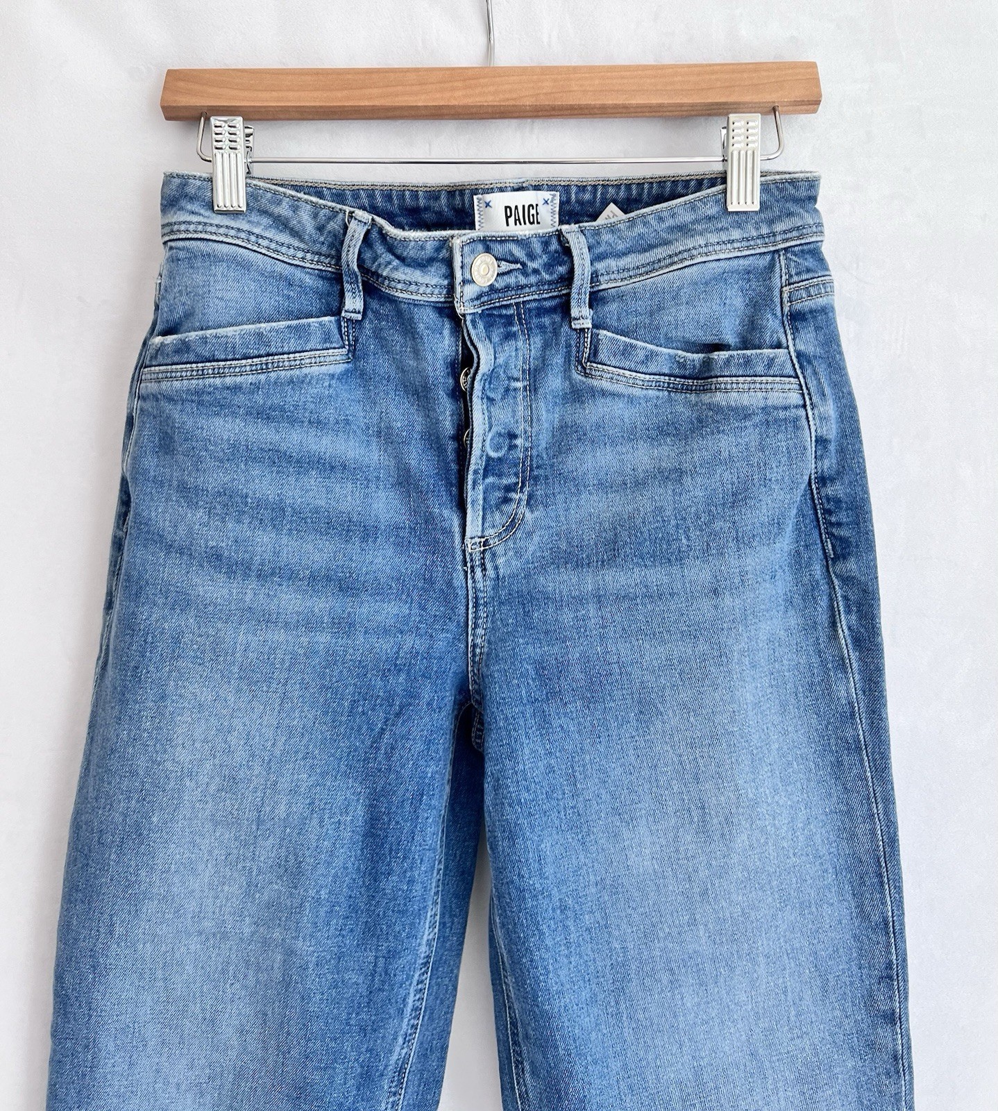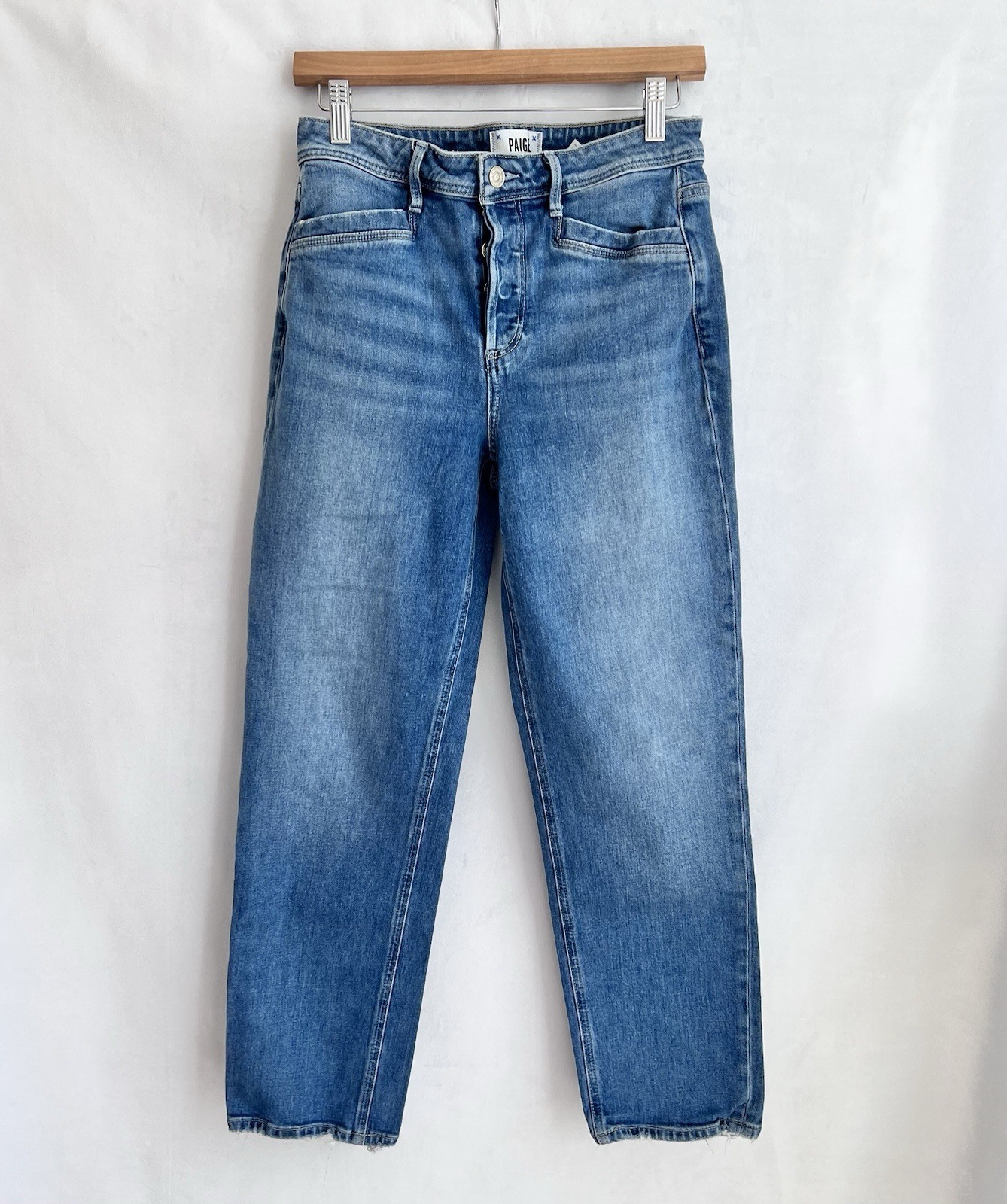 A true straight leg with a high-waisted silhouette and a cropped ankle length. This must-have pair is crafted in PAIGE VINTAGE denim and comes in a medium wash with with natural fading, light distressing, a covered button fly, trouser-inspired pockets, and a heavy grinded hem. PAIGE VINTAGE takes all of the work out of breaking in your favorite pair of vintage jeans. They've combined the comfort of stretch with everything you love about authentic vintage denim to create super soft jeans that feel perfectly lived-in from the very first wear.