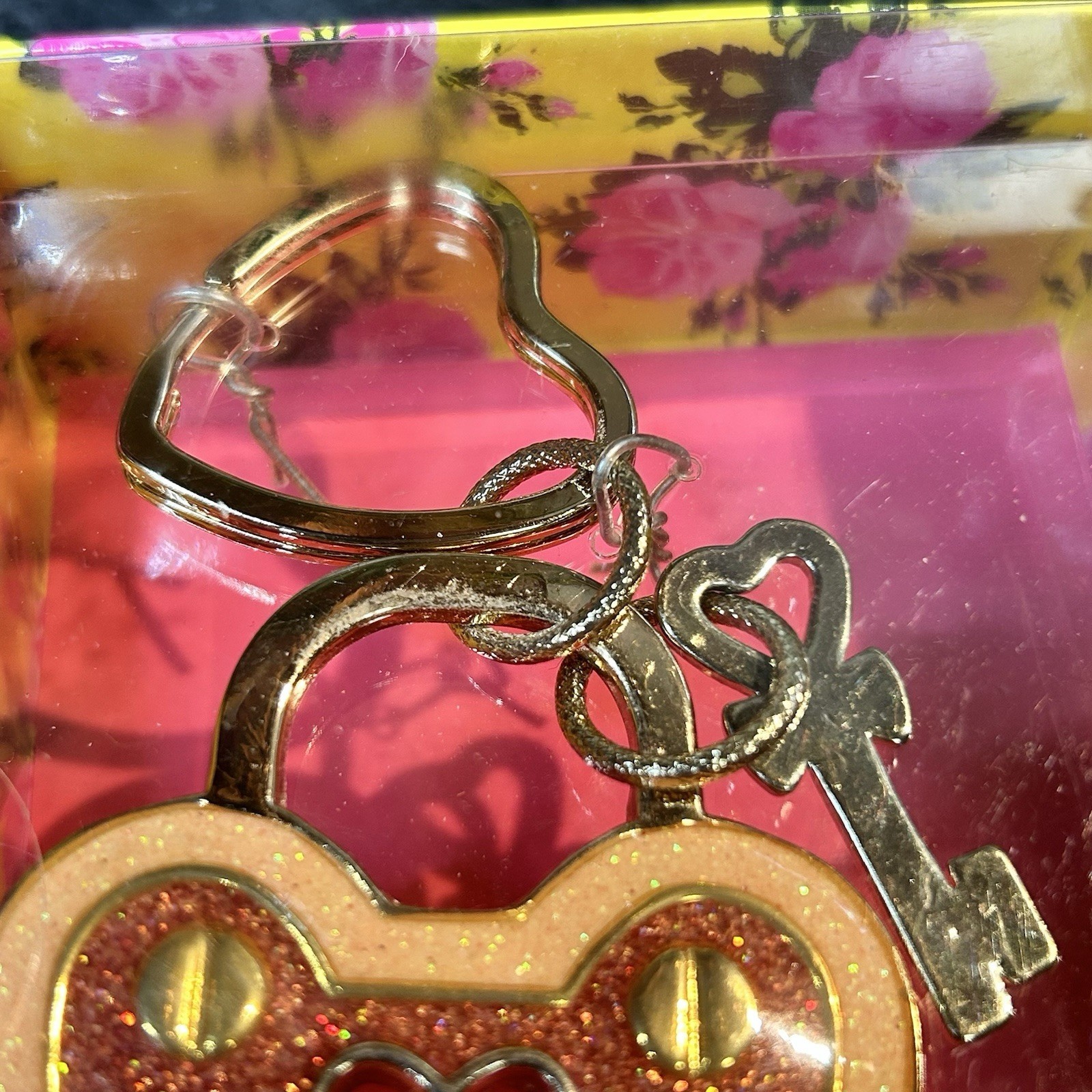 Vintage Y2K Betsey Johnson Gold Tone Heart Lock Key Pink Glitter Enamel Purse Charm, Key Fob, Keychain