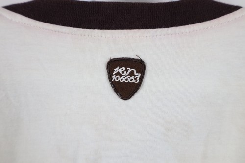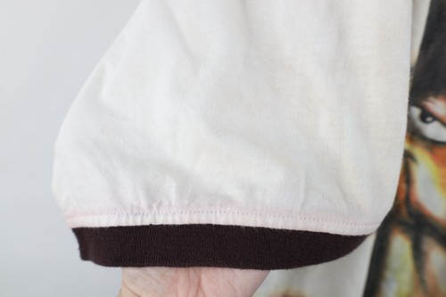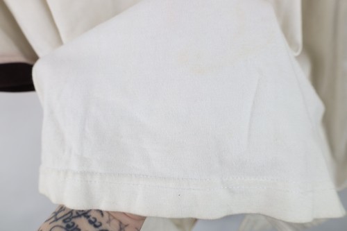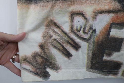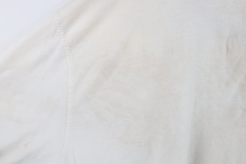 Stains throughout. Color bleed/discoloring collar, arms. Graphics cracking/faded. Color faded. Pilling