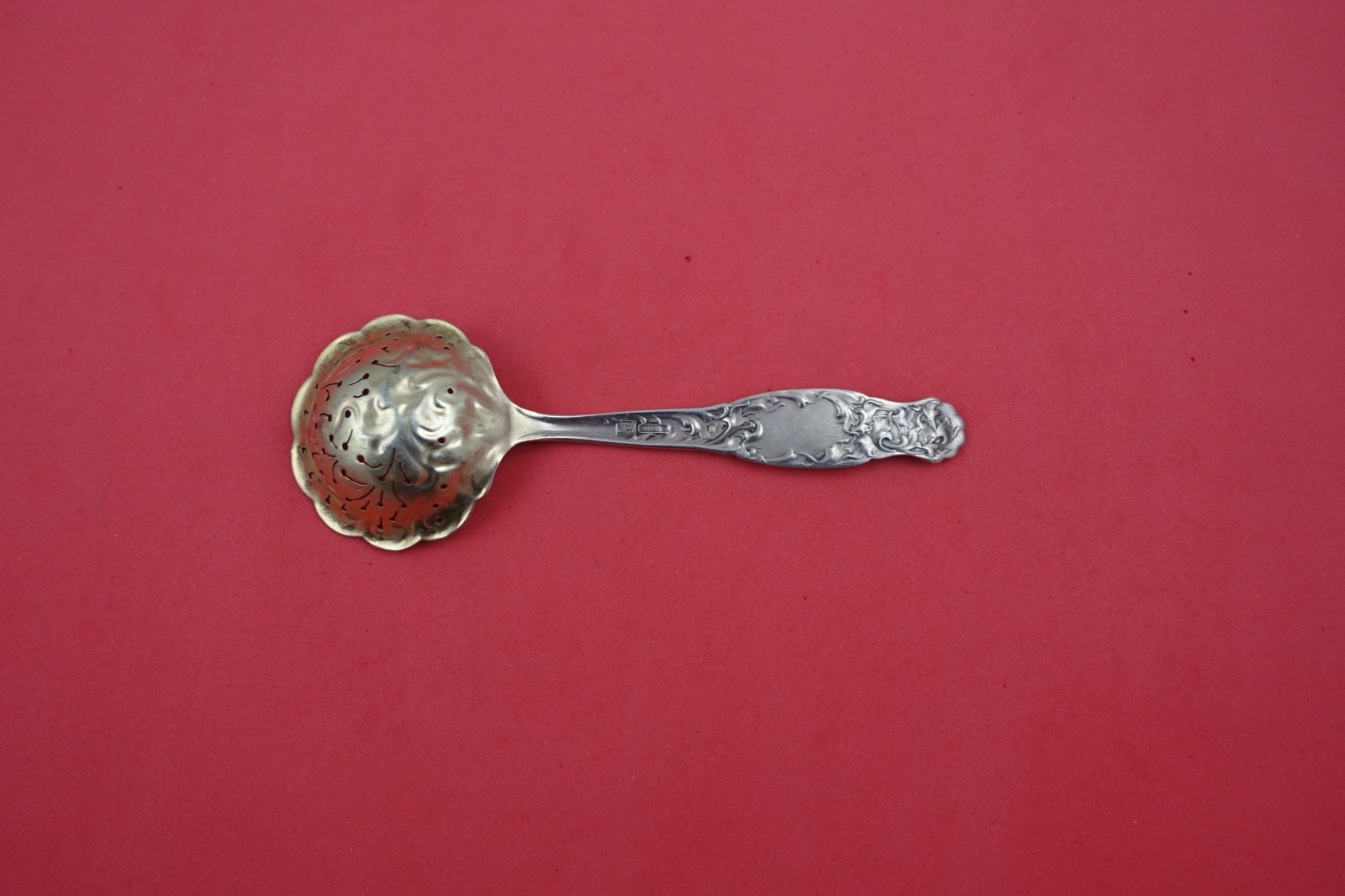 Sterling silver Sugar Sifter, gold washed with design in bowl and small hole piercing with stem 5 7/8" in the pattern Heraldic by Whiting. It is monogrammed (monos vary) and is in excellent condition.