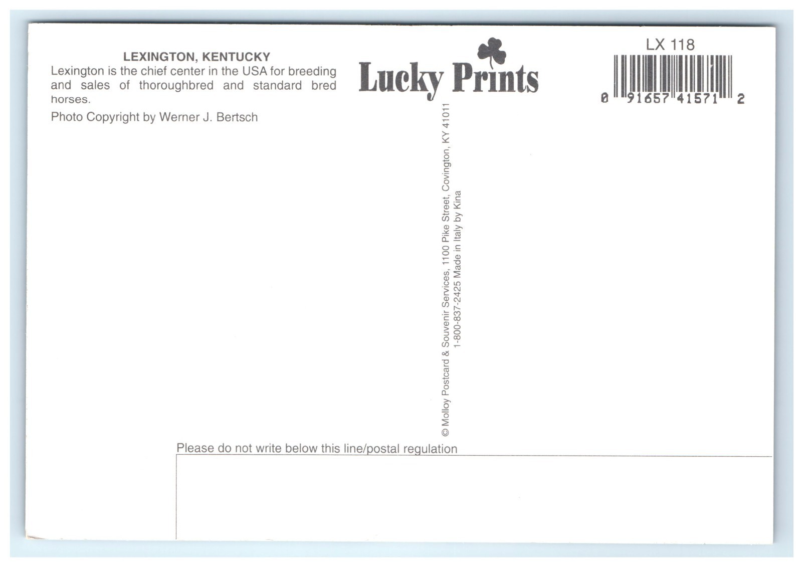 ? Back: Unused. Photo copyright by Werner J. Bertsch. Published by Lucky Prints, Covington, Kentucky. Card number LX 118.