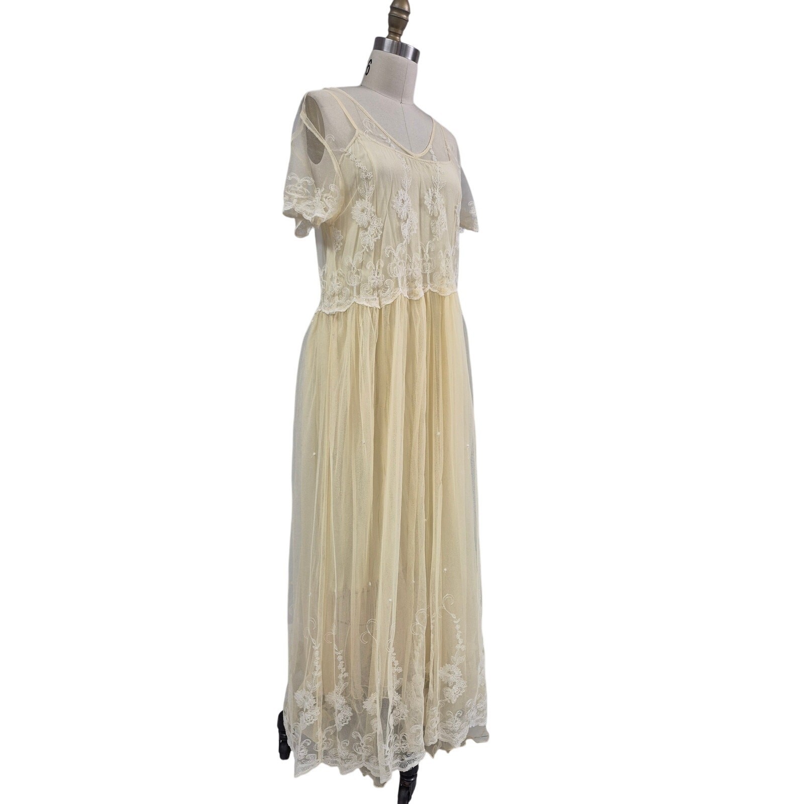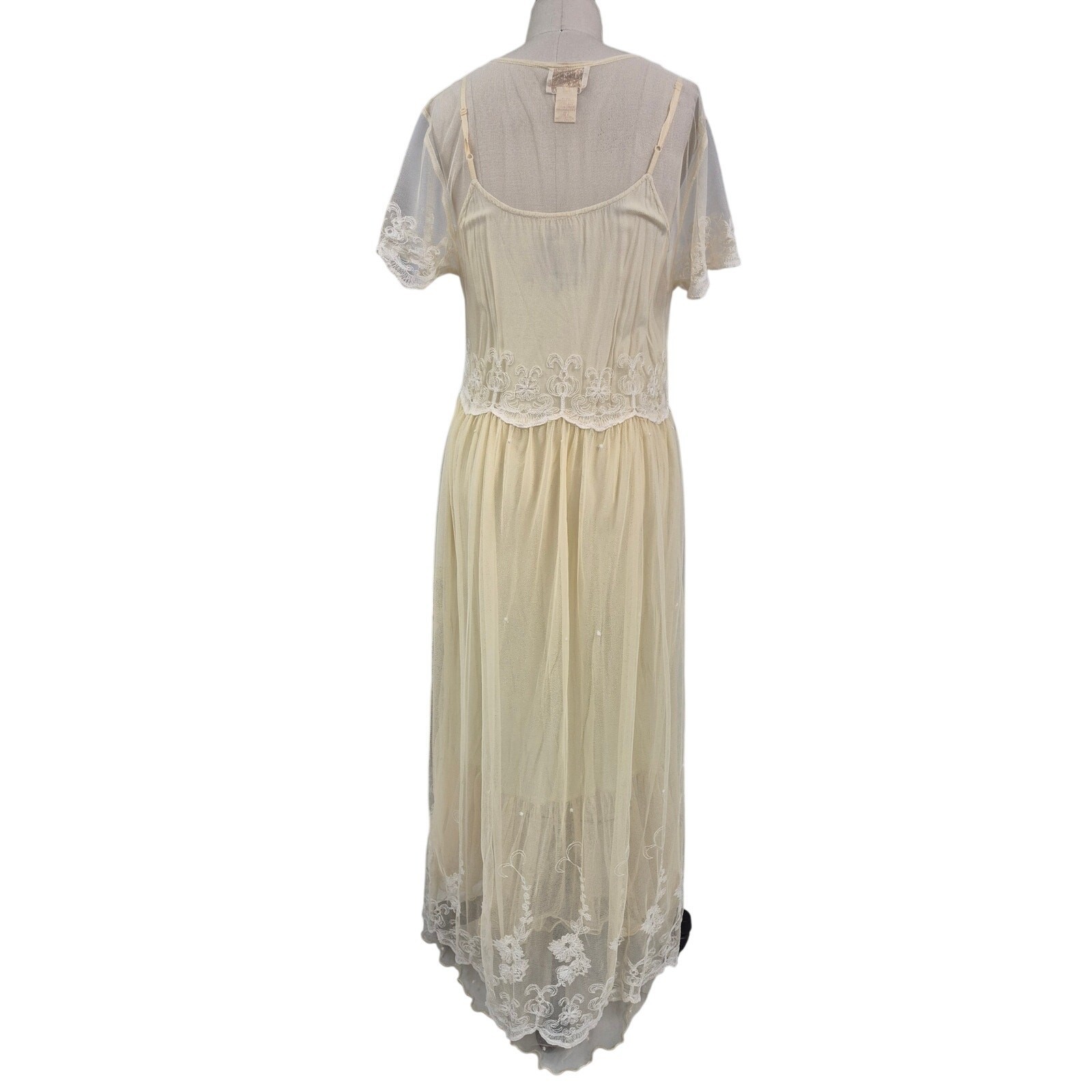 90s April Cornell Hopeless Romantic Boho Creamy Maxi Dress Sheer Mesh Overlay M