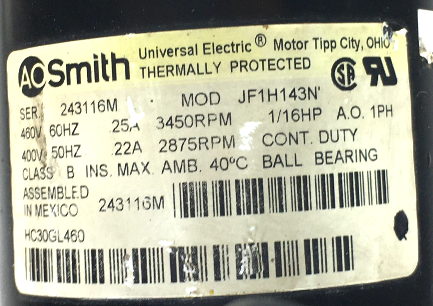 This is AO SMITH JF1H143N Draft Inducer Blower Motor HC30GL460 400/460V 1/16HP 2875/3450 RPM used HVAC part.