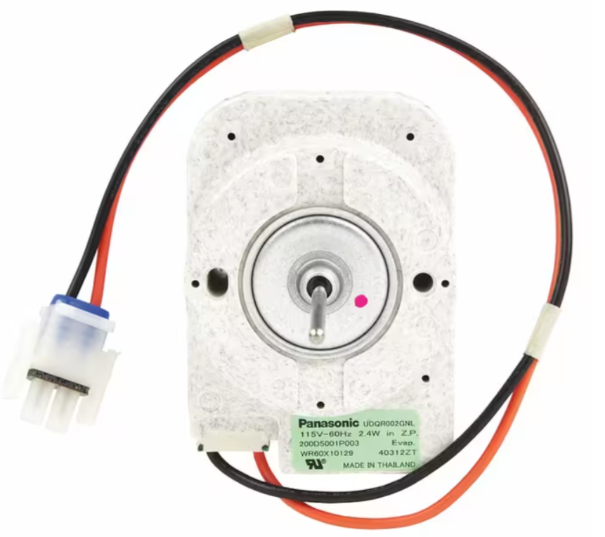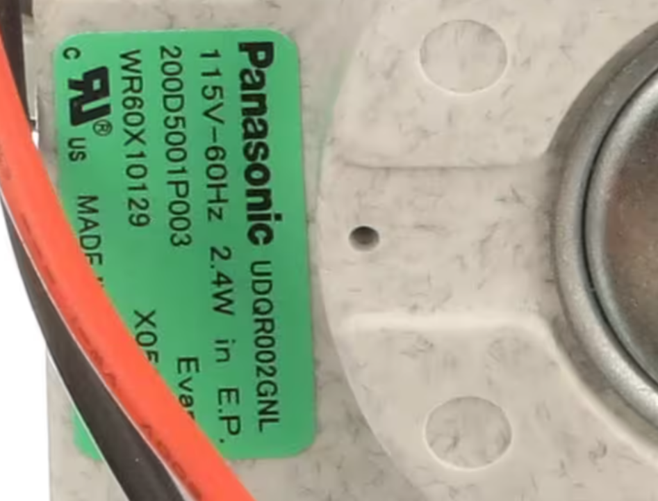The GE Appliance UDQR002GNL / WR60X10129 / 200D5001P003 Evaporator Fan Motor is a genuine OEM replacement designed for GE refrigerators. It circulates air across the evaporator coils, ensuring even cooling and maintaining consistent temperature throughout the refrigerator and freezer compartments.