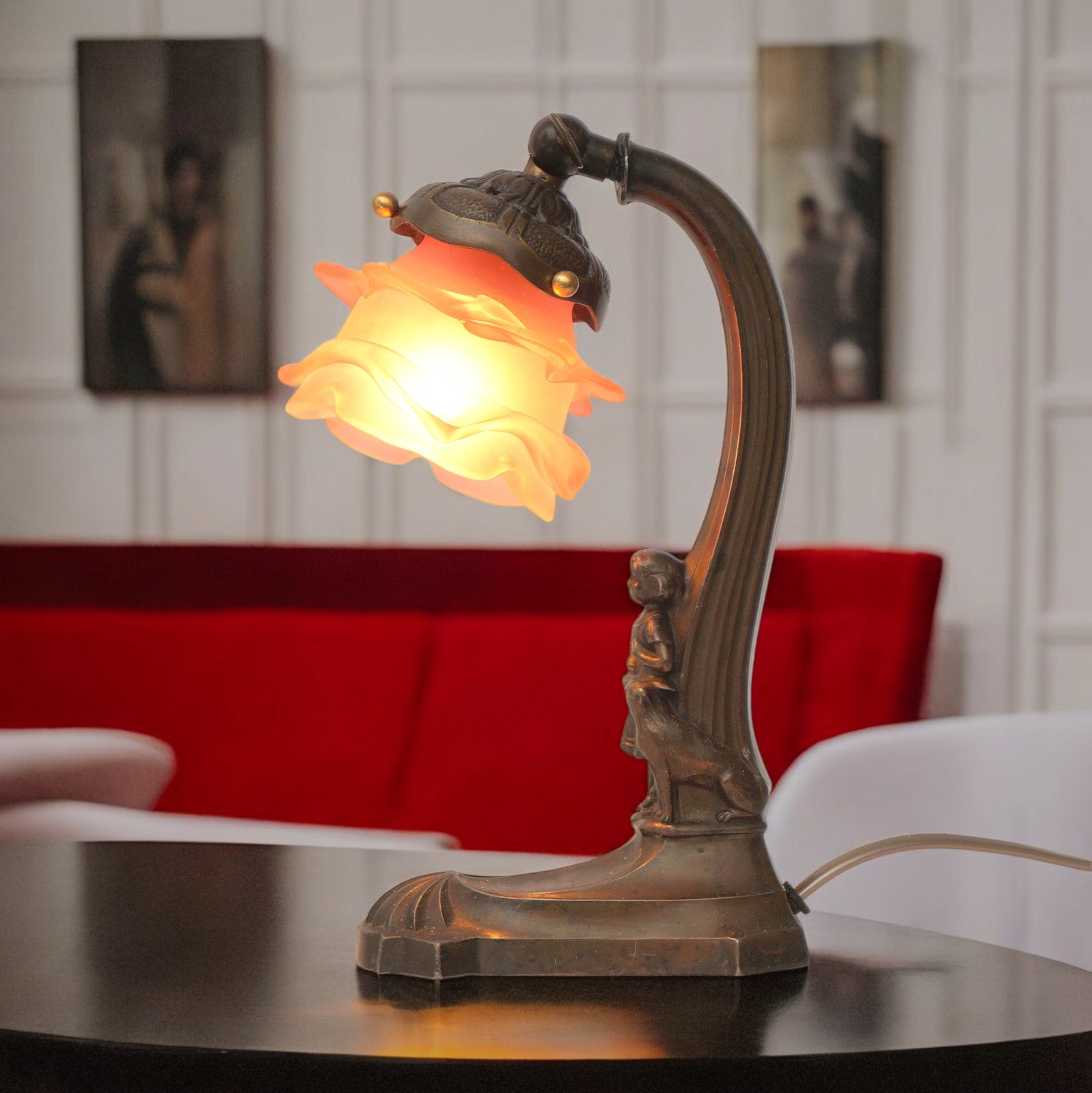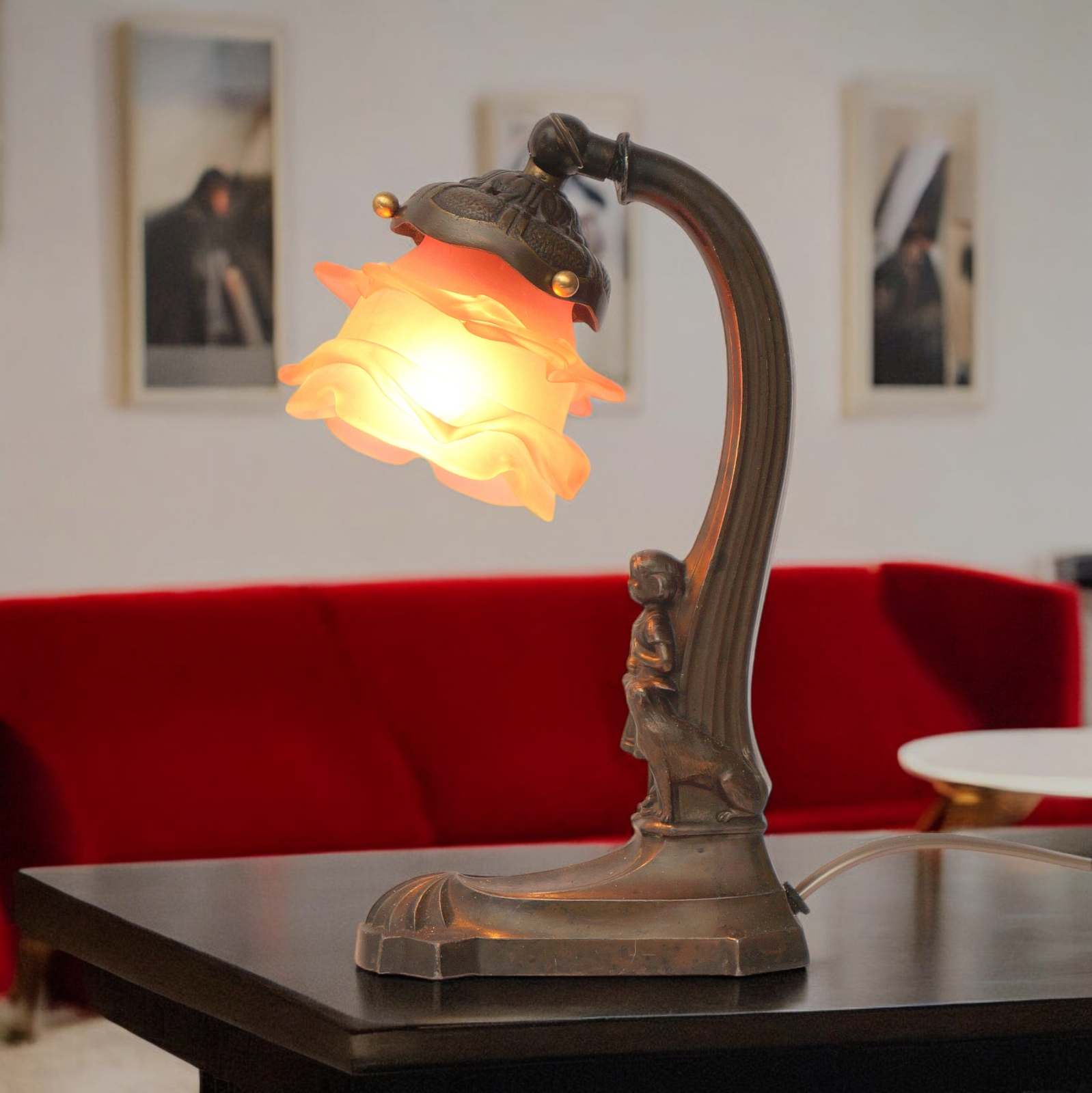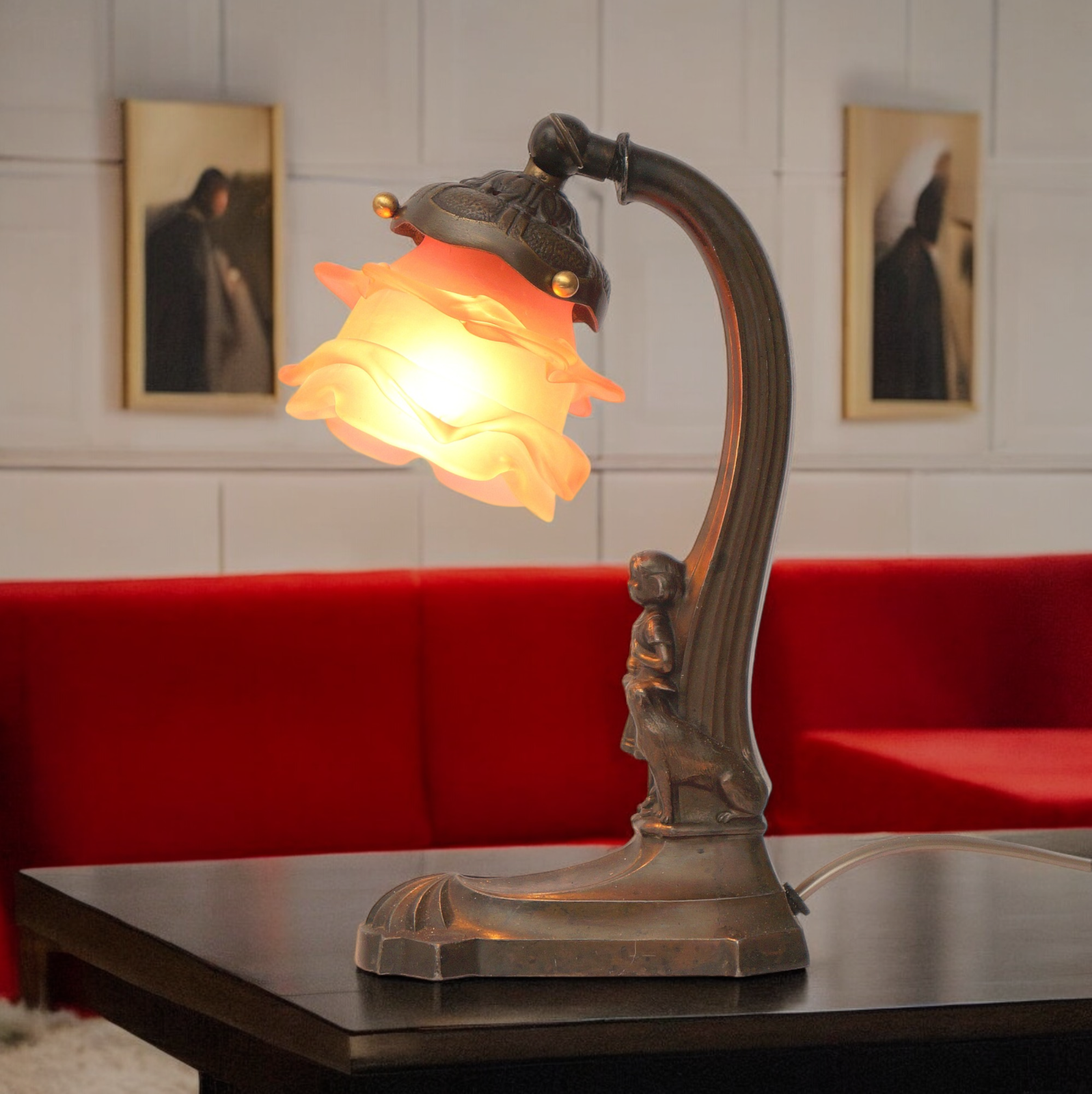 Beautiful original Art Nouveau bedside table/piano lamp "Maiden Dog".