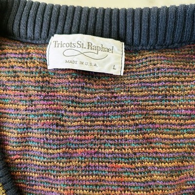 Add a touch of vintage charm to your wardrobe with this Tricots St. Raphael men's sweater, a standout piece from the 1990s. Featuring a bold zig zag pattern in rich jewel tones, this sweater combines classic retro appeal with timeless quality.