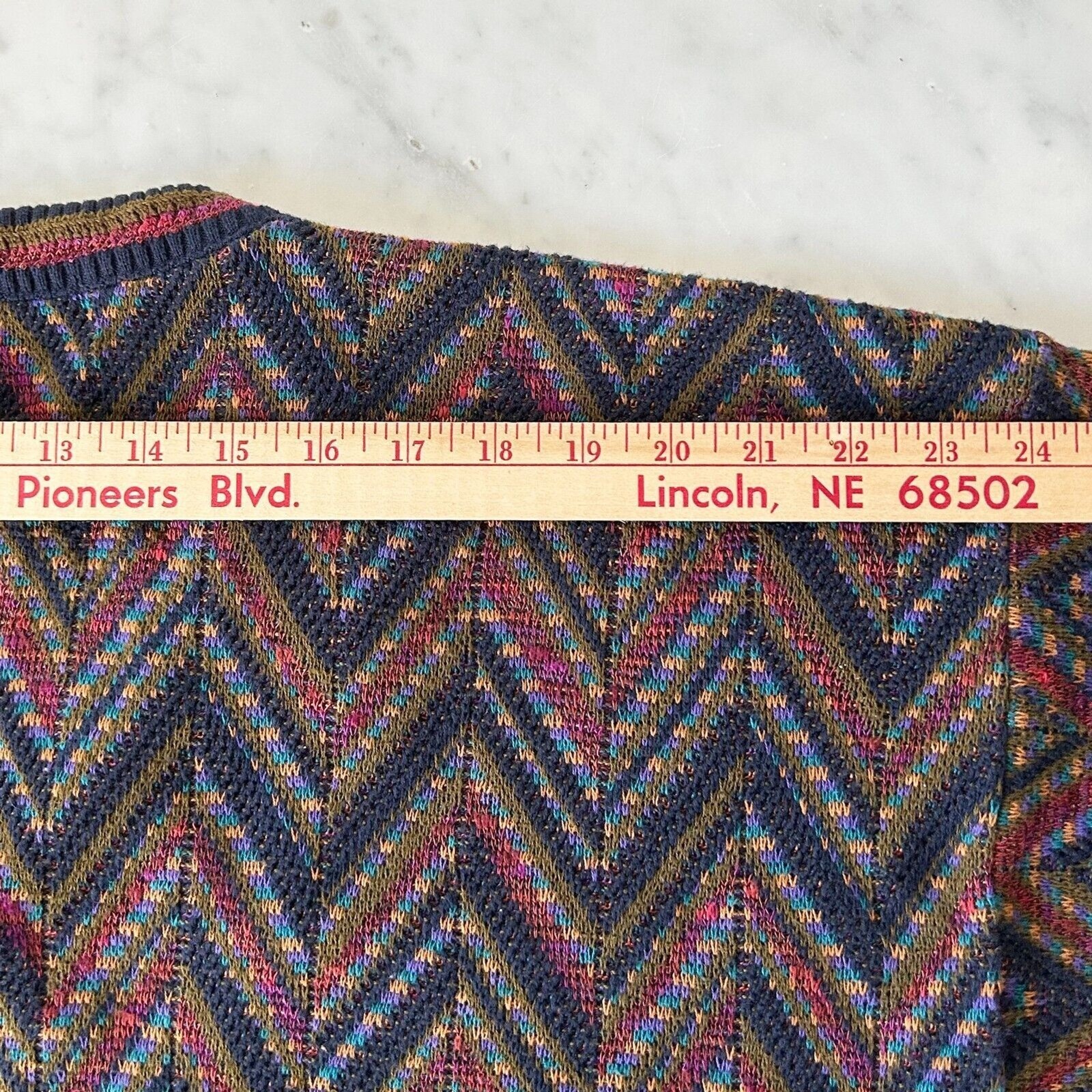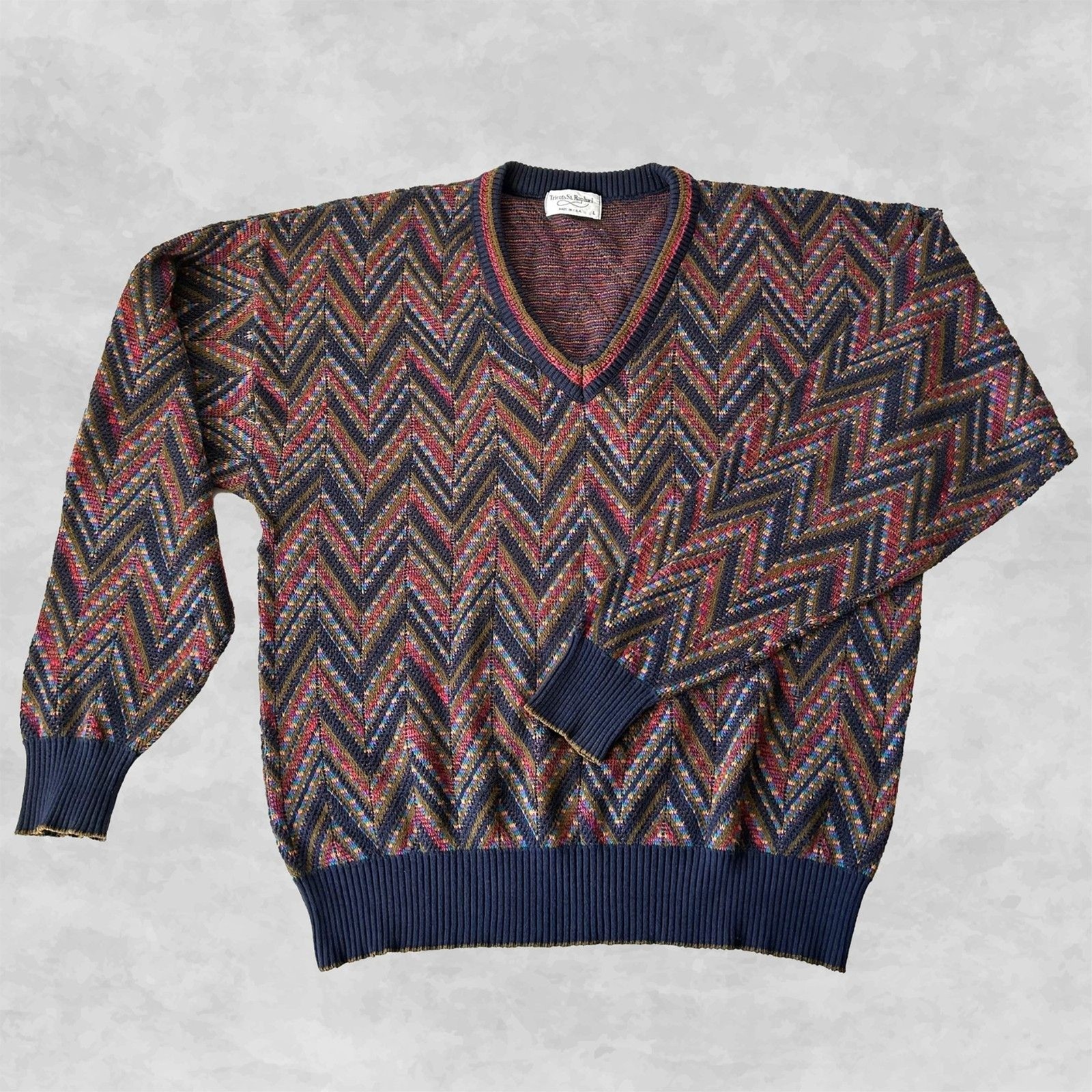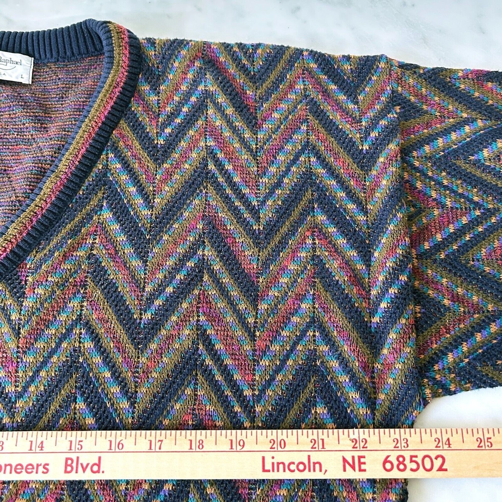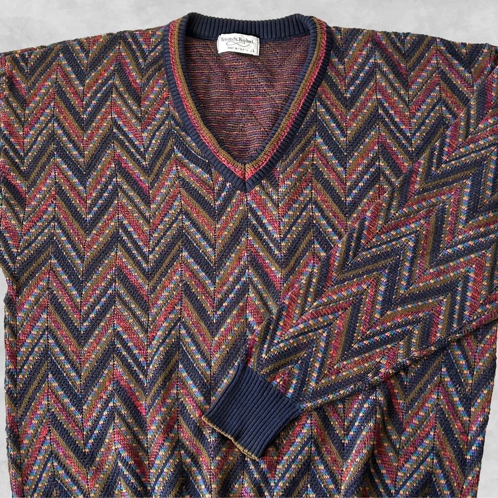 Tricots St Raphael Sweater Vintage 90s V Neck Zig Zag Jewel Tones-Men's Size L