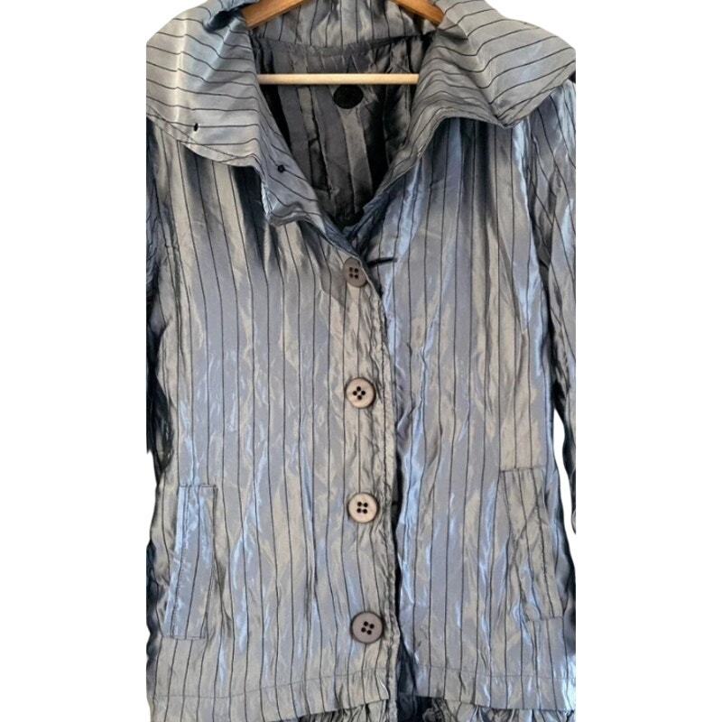 It features a bold metallic finish with playful polka dots and eye-catching ruffle detailing. Dramatic avant garde coat with a metallic sheen and bold polka dot pattern. Features a wide lapel collar, double?breasted button front, pockets and an exaggerated ruched ruffle hem. Lightweight taffeta?style shell with a soft lining; fits like a modern women?s M. Perfect for goth glam, artwear or statement street style with 80s, 90s and Y2K vibes. Pre?loved and in good condition with intentional crinkle texture. I ship on Monday, Friday and most Wednesdays. Have a fun time shopping!