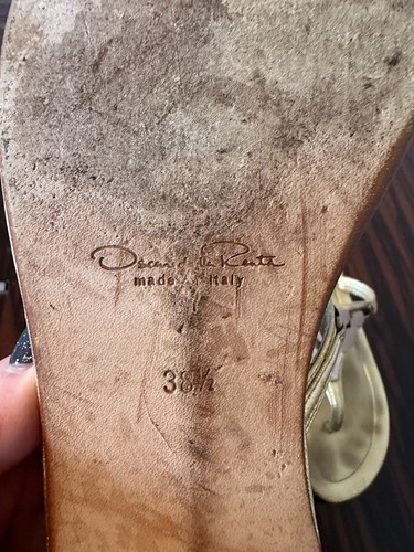 These pre-owned OSCAR DE LA RENTA metallic pewter leather thongs are in good condition aside for some wear (as shown in photos). They feature: