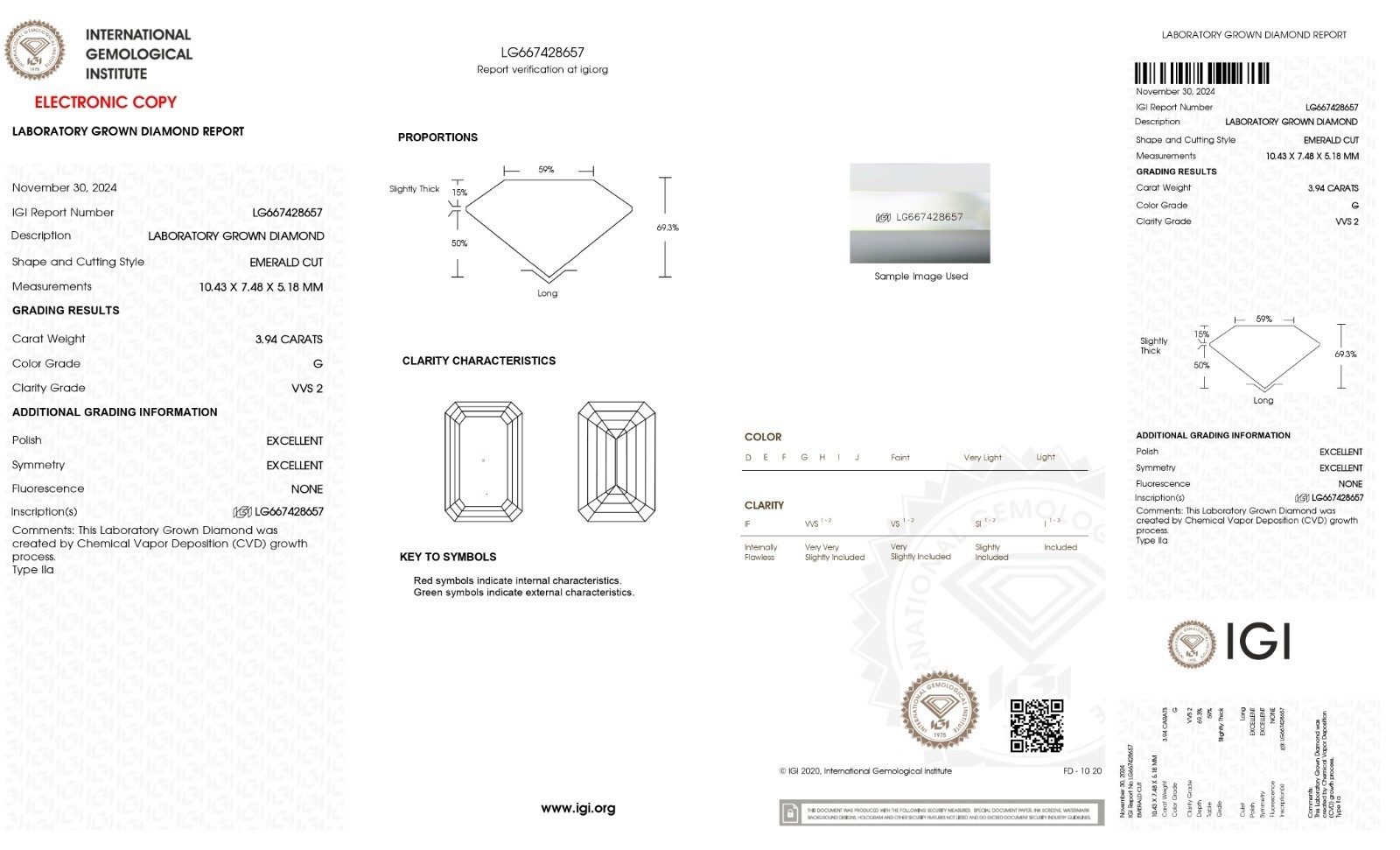 3.94 Ct EMERALD Cut IGI Certified Lab Grown CVD Diamond G Color VVS2 Clarity