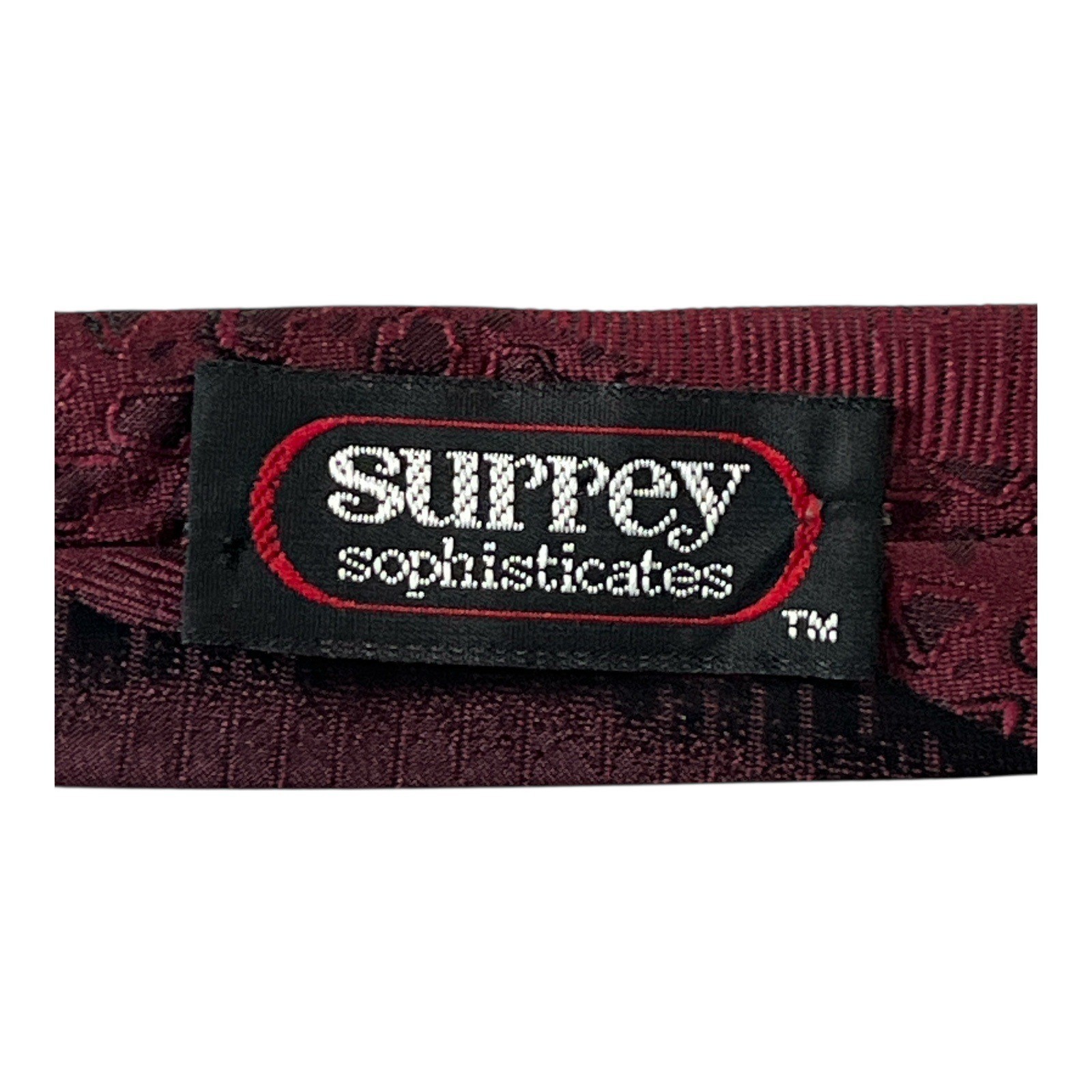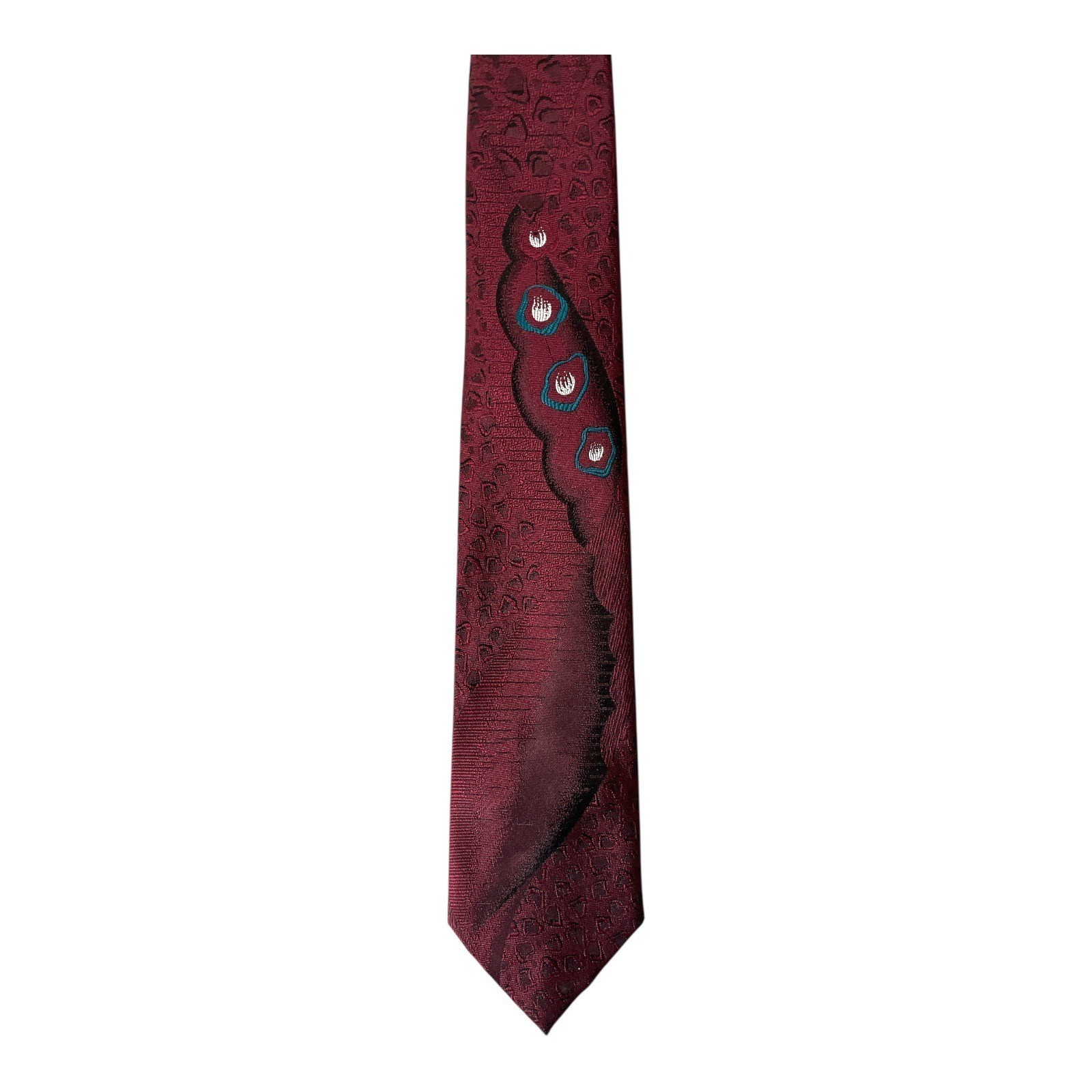 Vintage Surrey Sophisticates men?s tie featuring a deep maroon background with subtle textured patterning and an elegant peacock-feather inspired design in teal and silver. The narrow silhouette and rich color palette give it a timeless, refined appeal suitable for business attire or evening wear.