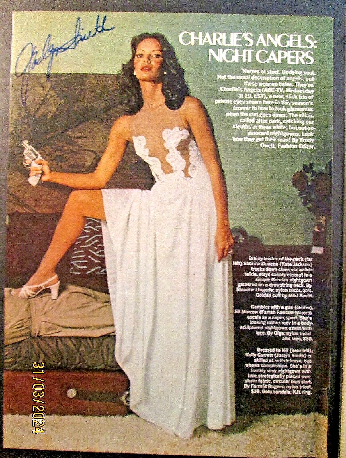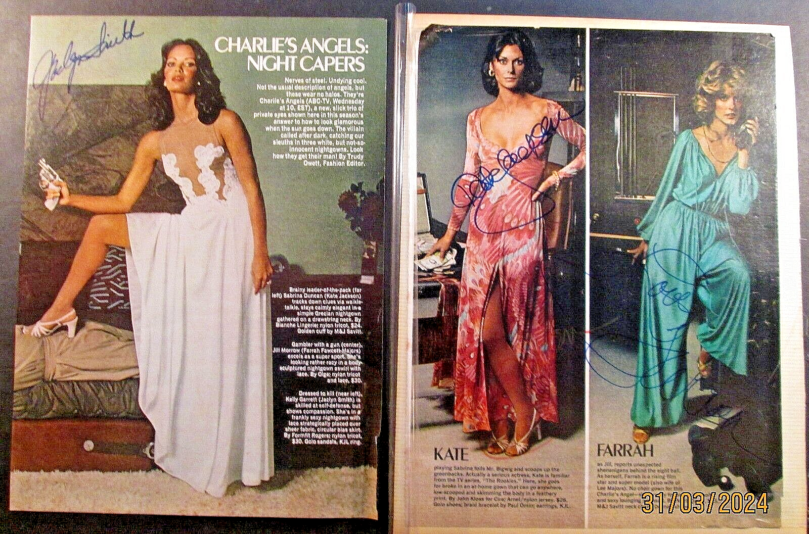 CHARLIE ANGELS HAND SIGN ON THIS EARLY MAGAZINE LAYOUT OF ALL THREE CHARLIE ANGELS, FROM MY PERSONAL COLLECTION VERY RARE, THIS WILL NOT LAST LONG ON THE BAY. SIGN BY (FARRAH FAWCETT,JACLYN SMITH, KATE JACKSON) (NOTE:THE PAGE WITH TWO OF CHARLIE ANGELS ON ,HAS A CARDBOARD RUBBER SURFACE BACKING,AND IS PART OF THE PAGE) PRICE AS IS