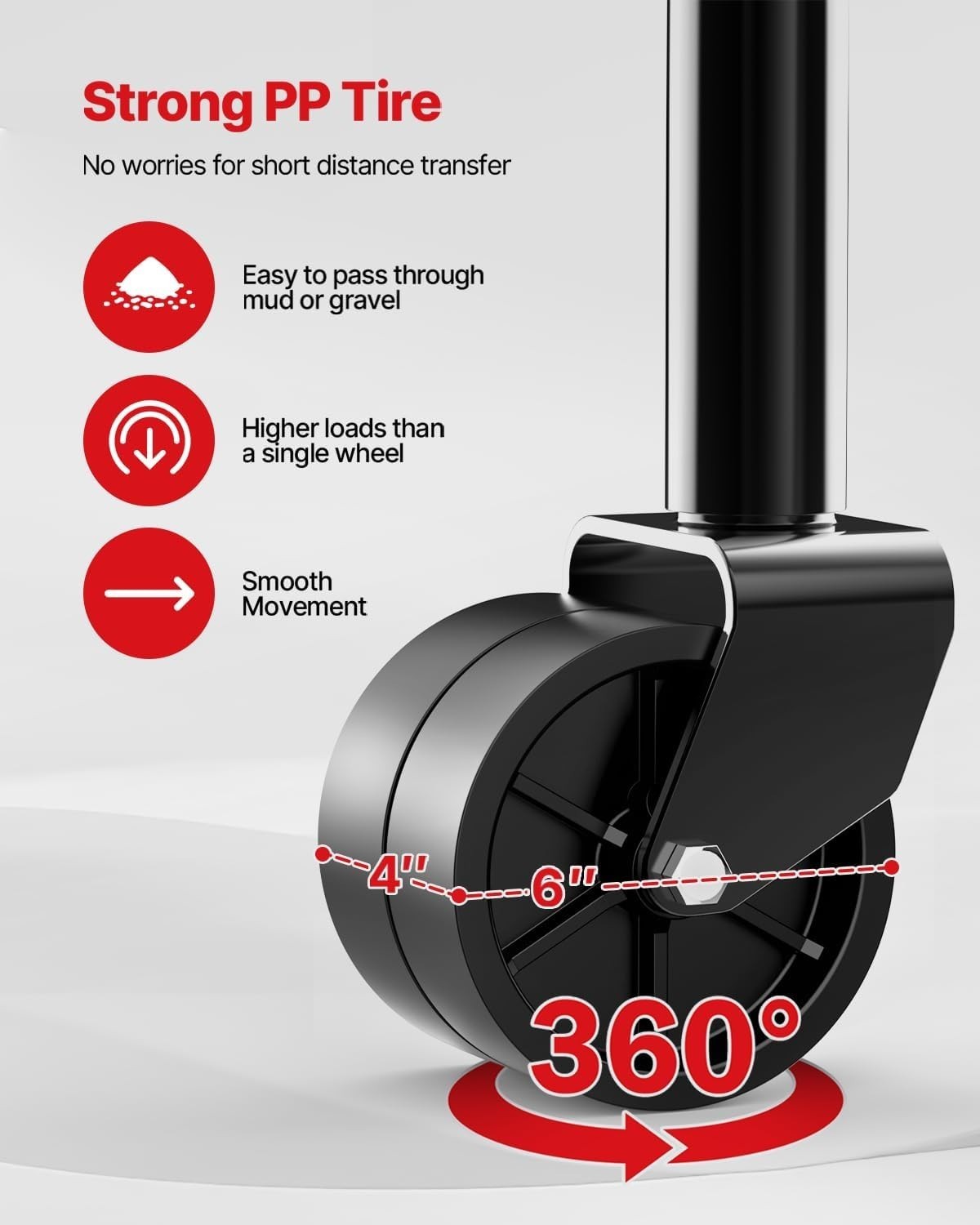 All-Terrain Mobility: Equipped with dual PP tires, it glides effortlessly over mud, gravel, and rocky surfaces. The wide tread design prevents sinking and provides superior stability on uneven terrain