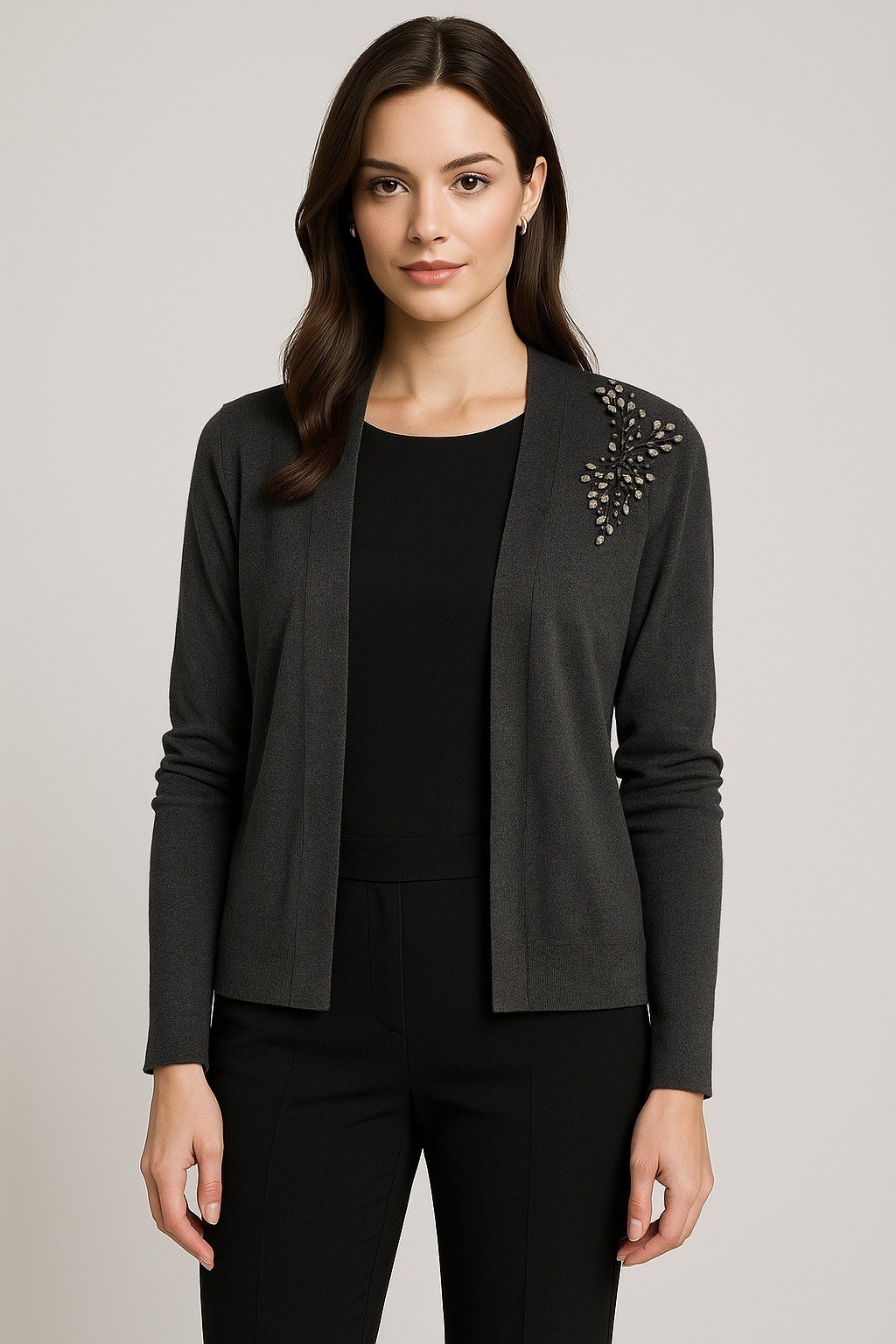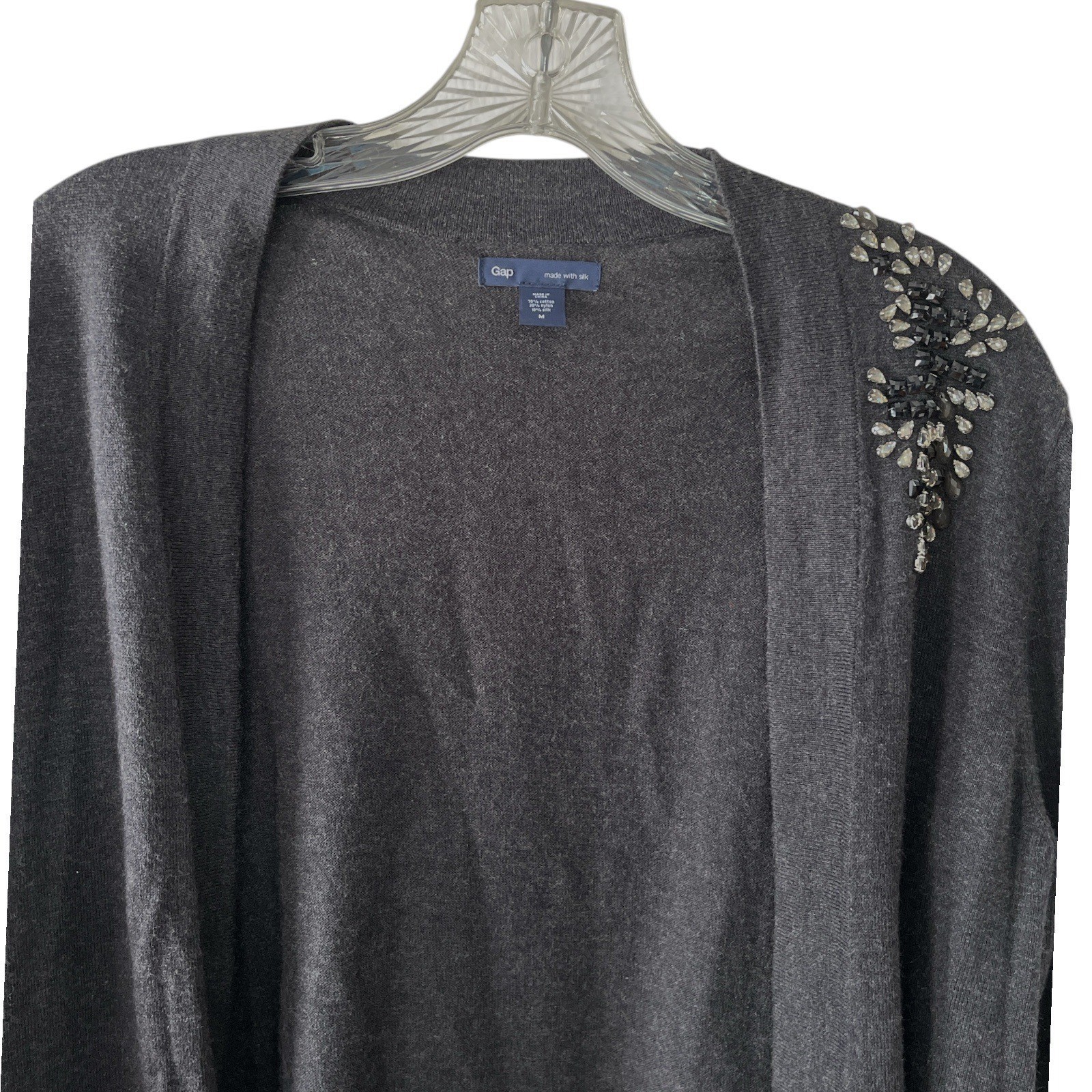Elegant open-front cardigan from GAP featuring a soft silk-blend knit in rich charcoal gray. The standout detail is the right shoulder, adorned with black and clear faceted bead embellishments that add a subtle sparkle. Lightweight and versatile, this piece transitions effortlessly from workwear to evening style.
