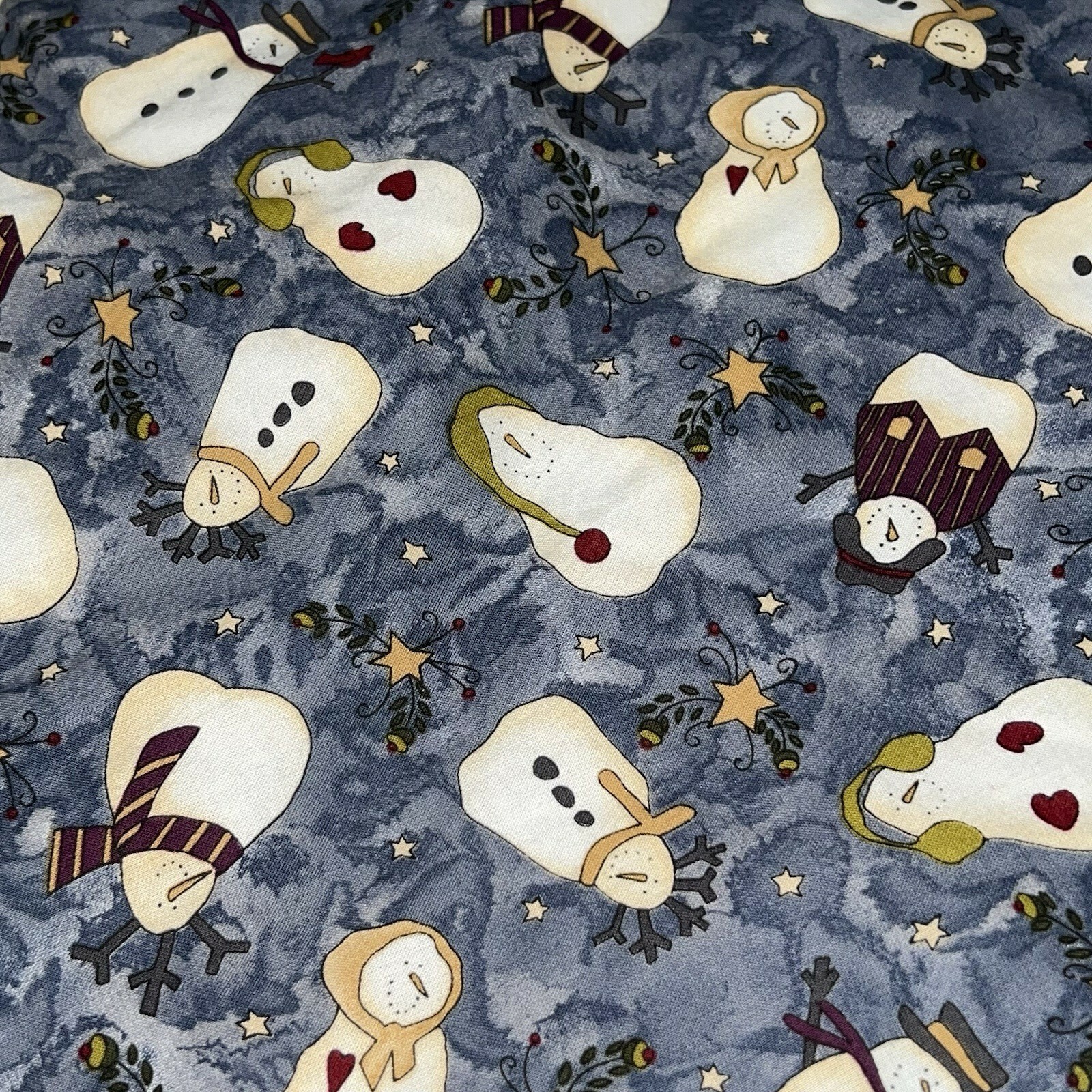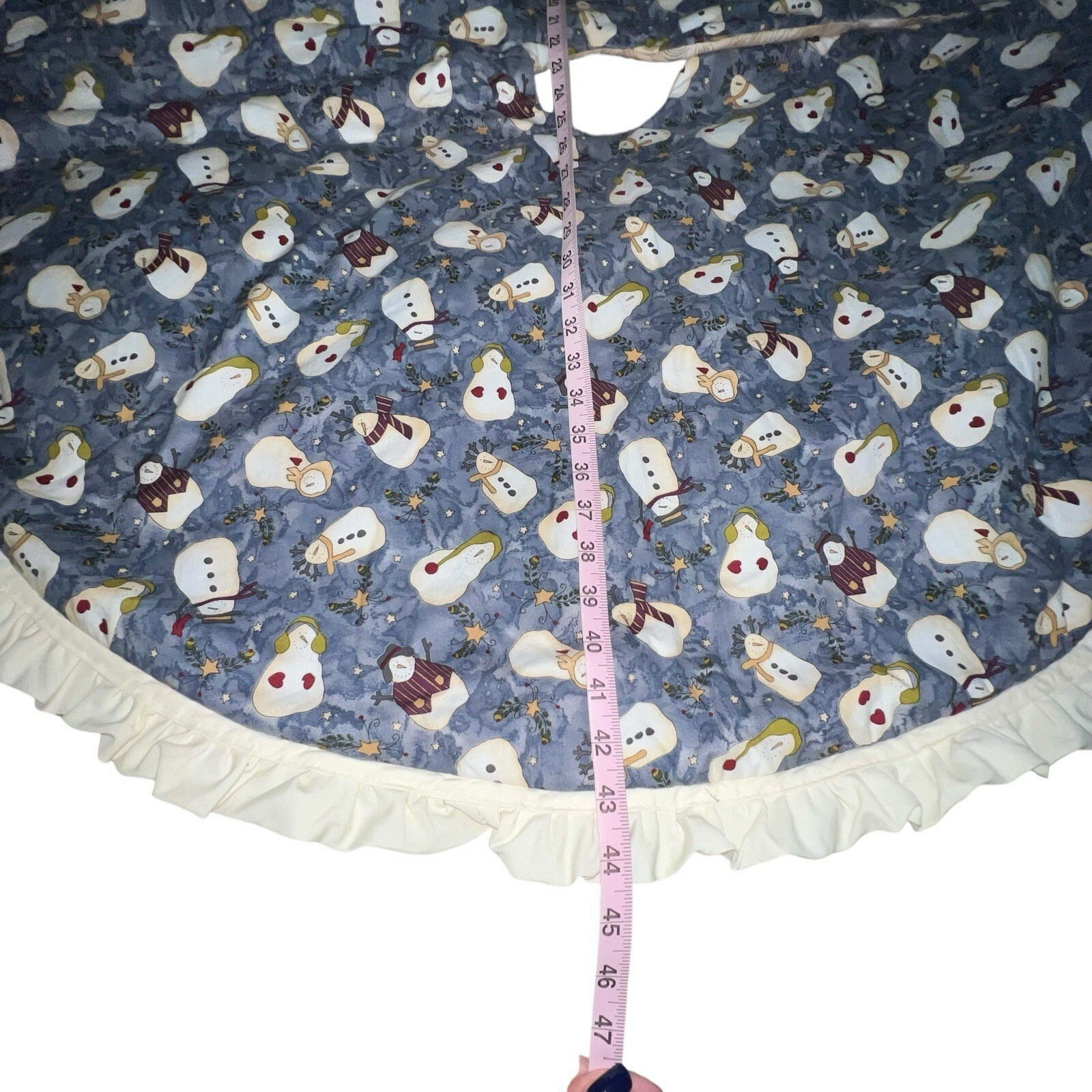 Vintage Handmade Quilted Snowman Christmas Tree Skirt Ruffle Trim Blue 44”