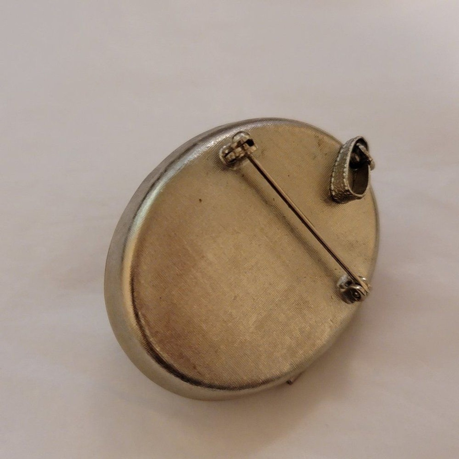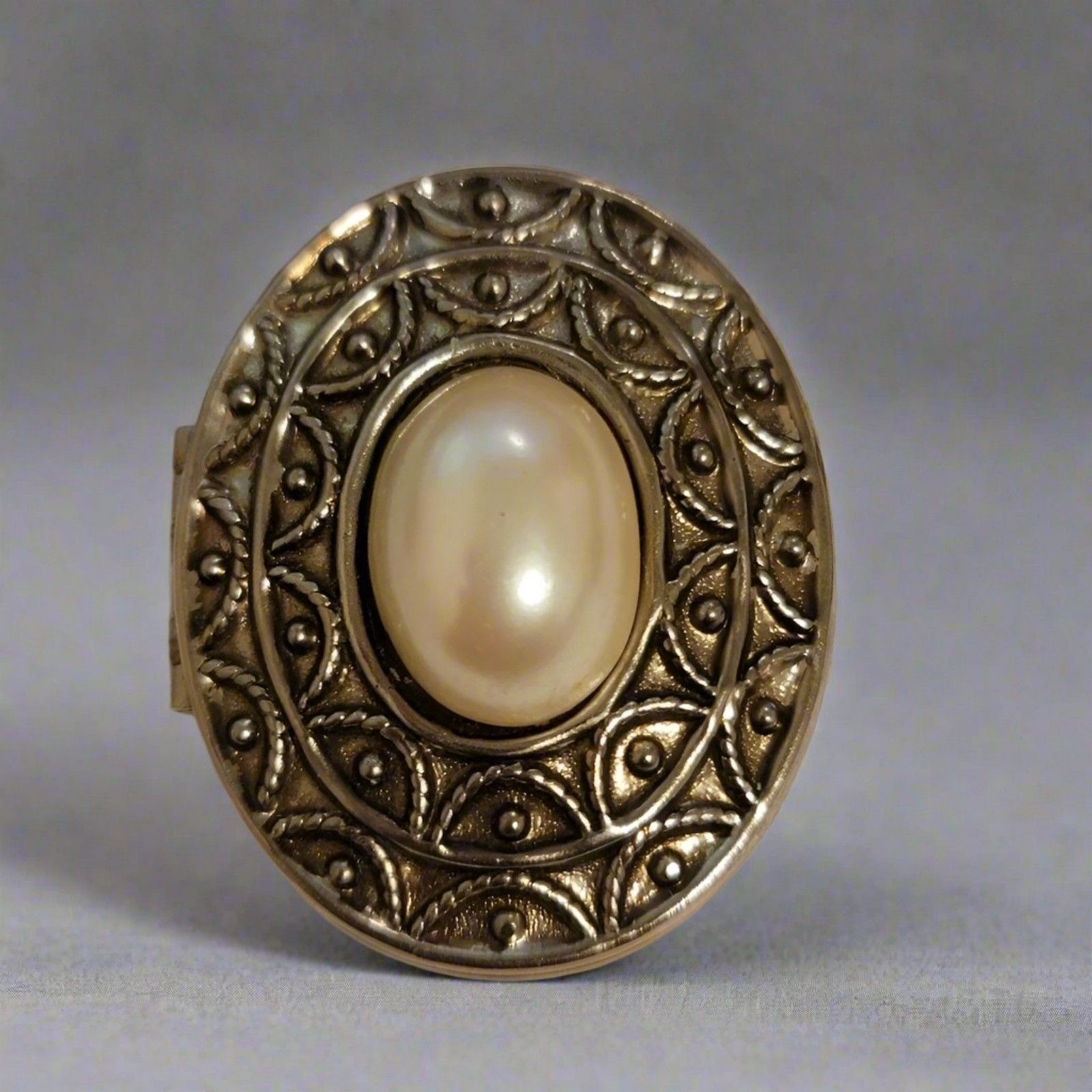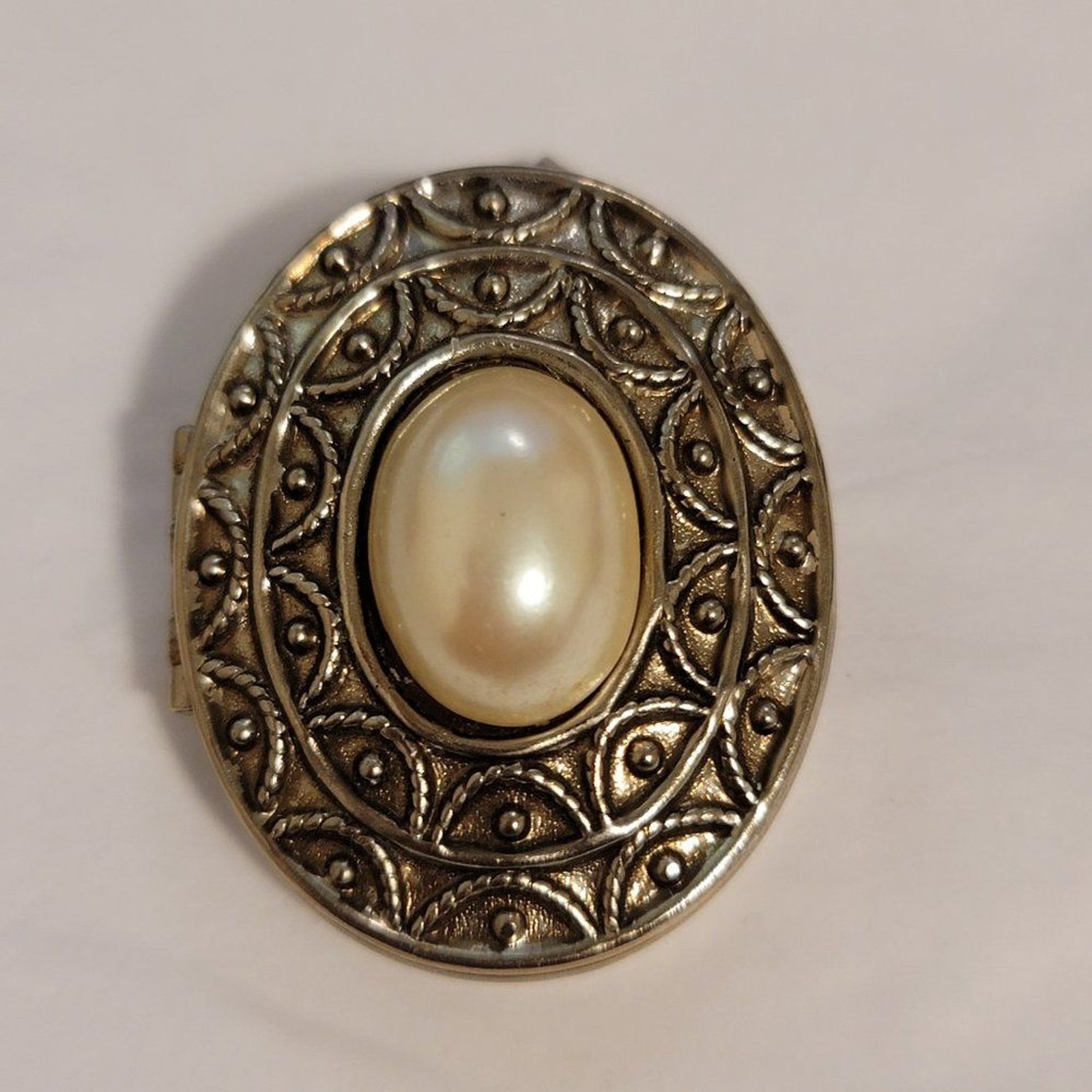 Elegant vintage Avon silver-tone perfume locket brooch featuring a raised faux pearl cabochon framed by an ornate embossed design. The back opens to reveal a small compartment for solid perfume or a keepsake. Beautifully detailed with classic vintage charm, this piece doubles as both jewelry and a conversation piece. In good preowned wearable condition with light age wear and slight tarnish; will need gentle cleaning.