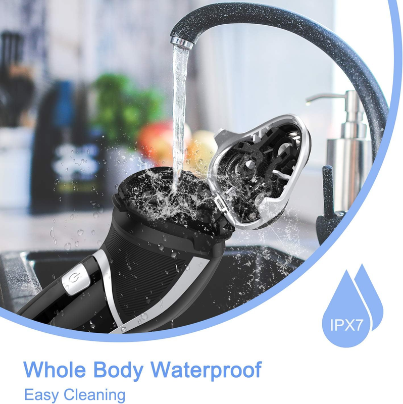 IPX7 Waterproof Dry Wet Shaving: the whole body of the rechargeable mens shavers is waterproof, you'll get a convenient dry shave or a refreshing wet shave with gel or foam, even in the shower; Clean the shaver with ease, at the touch of a button, flip open the shaver head and rinse with water; Note: we recommend you to replace the shaver head every 6 month for best shaving result