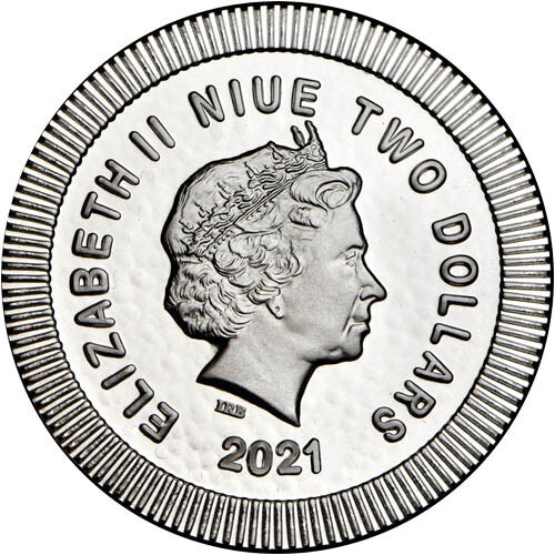 The reverse field of the 2021 1 oz Niue Silver Athena Owl Stackable Coin comes with a depiction of the owl of Athena. The virgin Goddess of Wisdom, Athena became associated with the owl because of the birds existing symbolism and association with knowledge and wisdom. The owl is featured in left-profile relief with two large eyes. Both sides of the coin have a stackable rim design that consists of alternating raised-lowered ledges to ensure easy stacking.