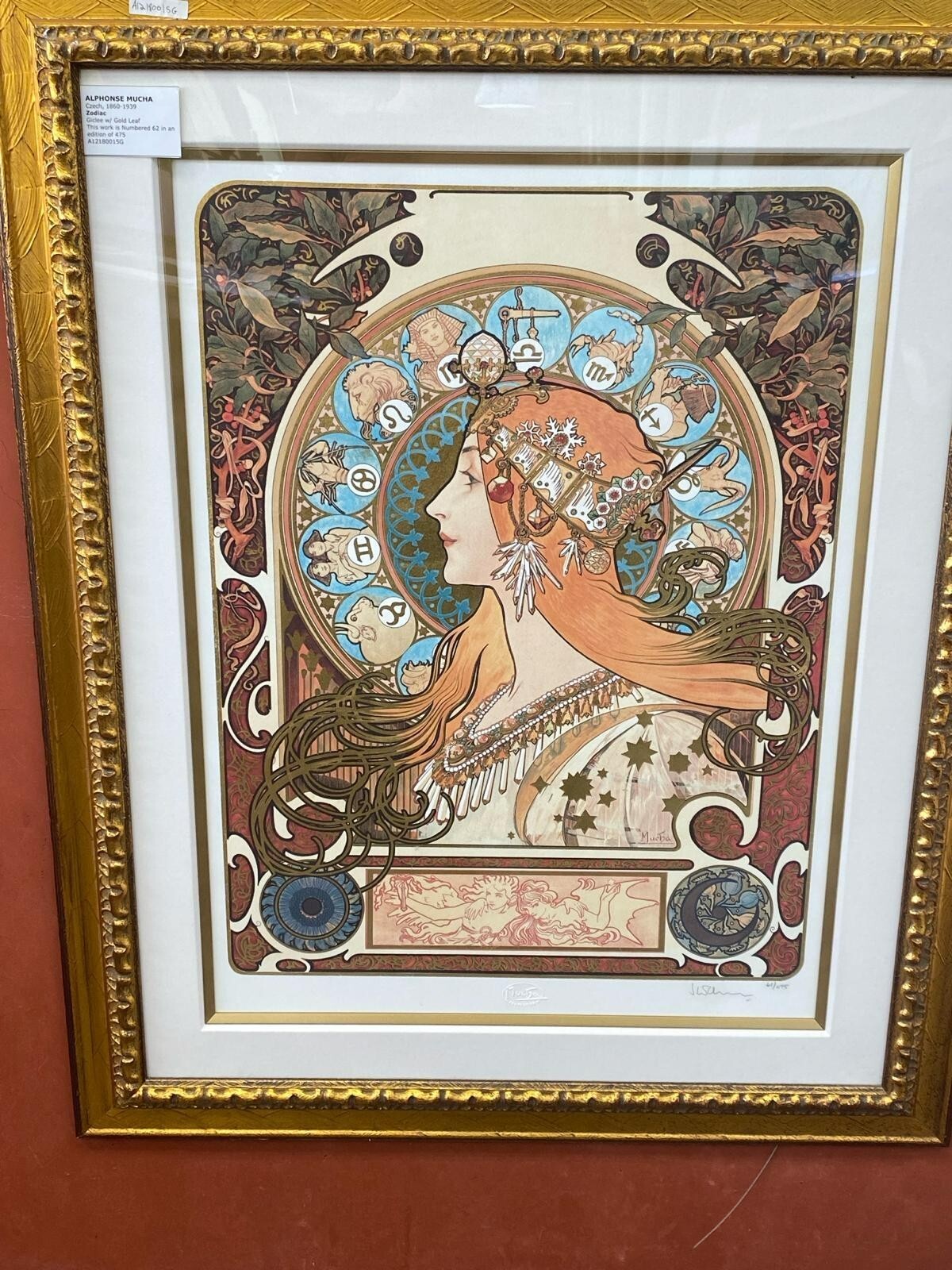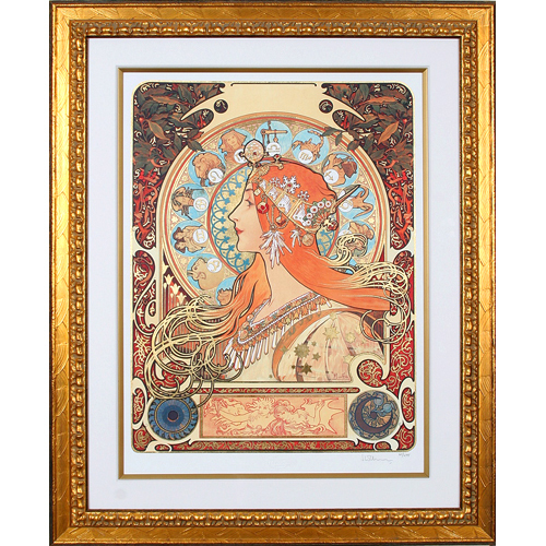 "ZODIAK" by ALPHONSE MUCHA (1860-1939) Giclee on Archival Paper with Gold Leaf Framed size: 41 1/2 in. L x 33 1/2 in. W. This work is numbered 61 in an edition of 475 Alphonse Mucha, was a Czech Art Nouveau painter and decorative artist, known best for his distinct style. He produced many paintings, illustrations, advertisements, postcards and designs. The item you are Bidding on is Exclusively licensed Mucha Foundation images. There were a limited number of estate supervised, approved and hand signed editions. Mucha fine art prints have been created using state-of-the-art techniques and beautiful gold leafing. Each print is signed and numbered by John Mucha and Please call us with any Inquiries: Continental Coin and Jewelry Company Web Department: Monday - Friday, from 10:30 am - 6 pm