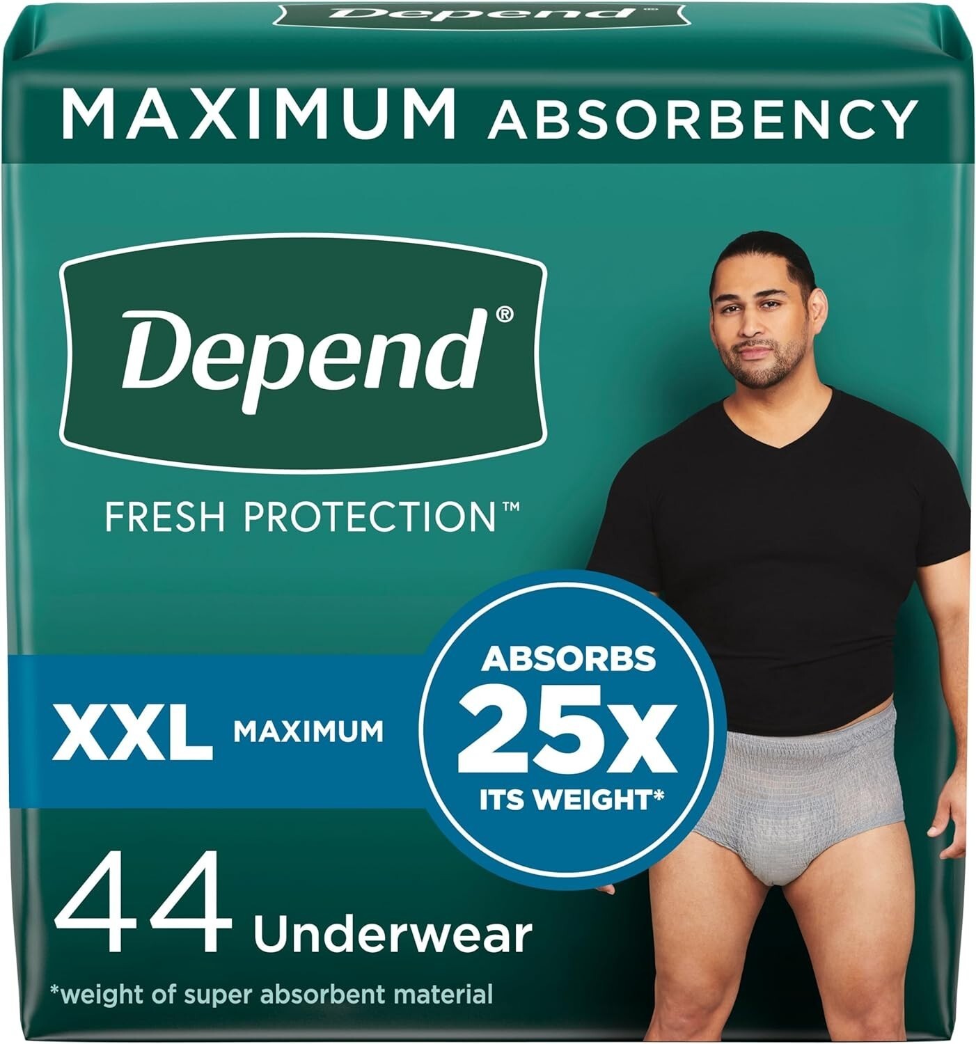 Maximum Absorbency: Depend men?s bladder leakage underwear features a super absorbent core which absorbs 25x its weight* and turns liquid into gel for all-day protection (*weight of super absorbent material)
