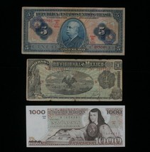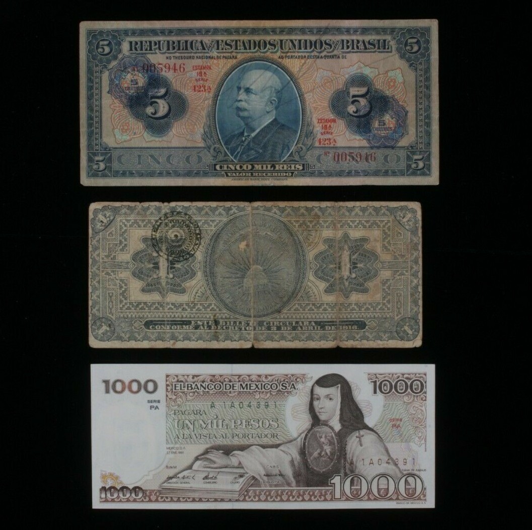 Mexico Brazil 3-Notes Lot // Mexican 1-1000 Pesos Brazilian 5 Cruzeiros