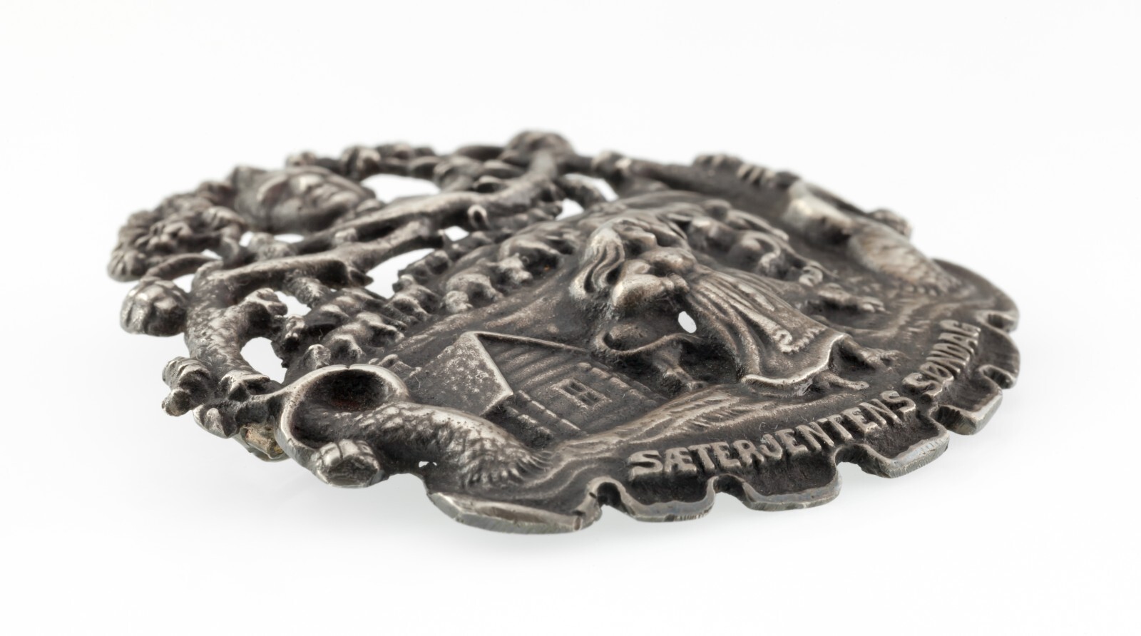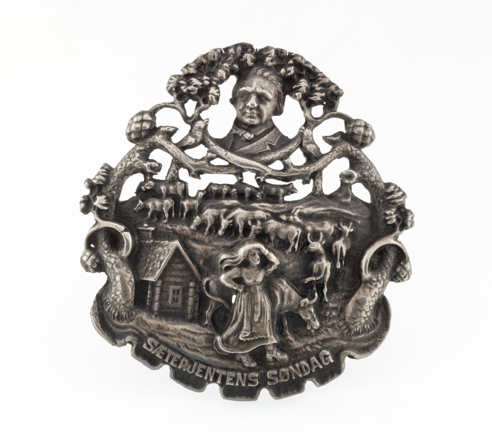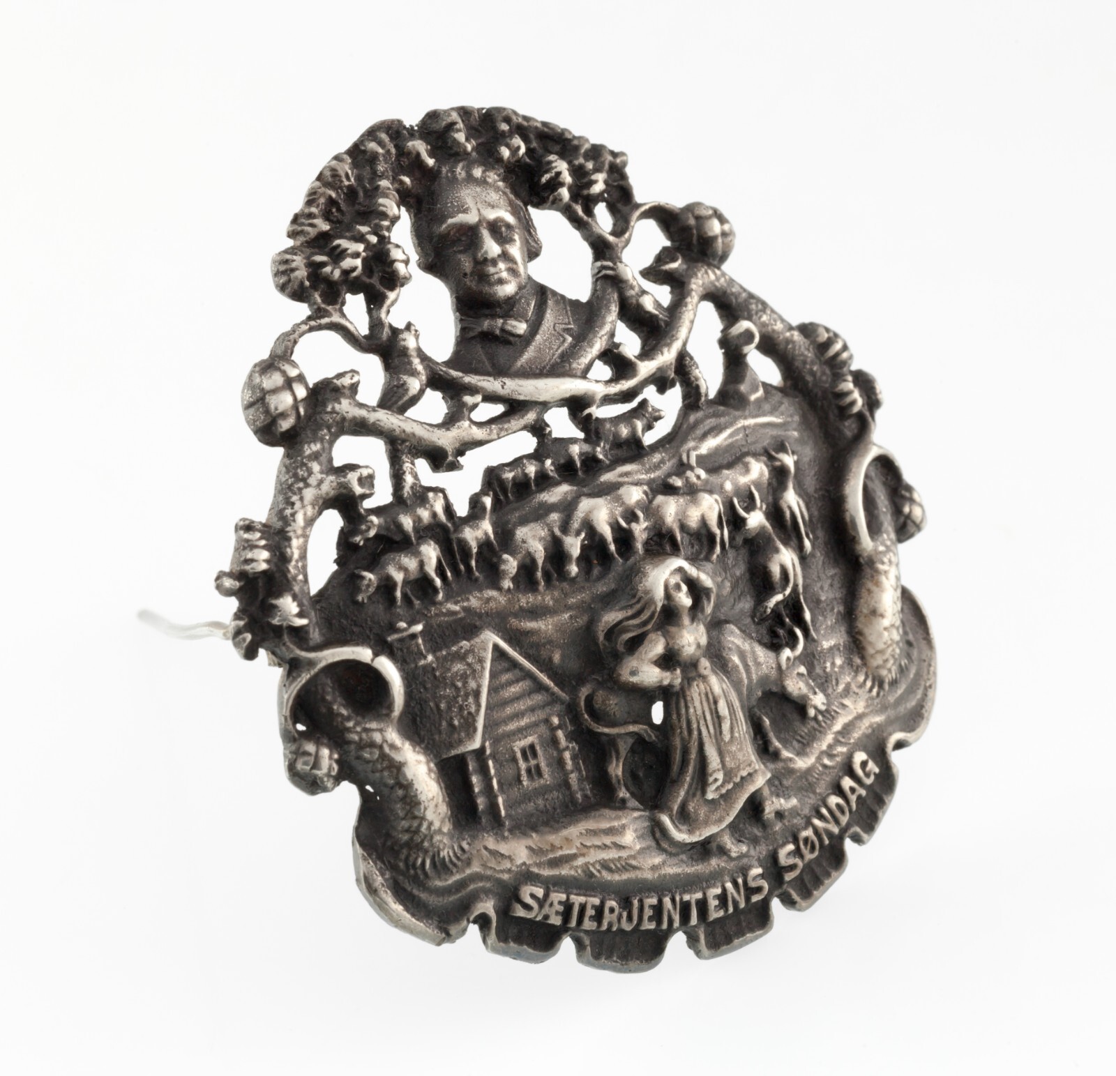 Gorgeous Brooch of a Women looking off into the distance with a farm house and cattle in background. Older Male bust above described scene. Bottom reads "SAETERJENTENS SONDAG"