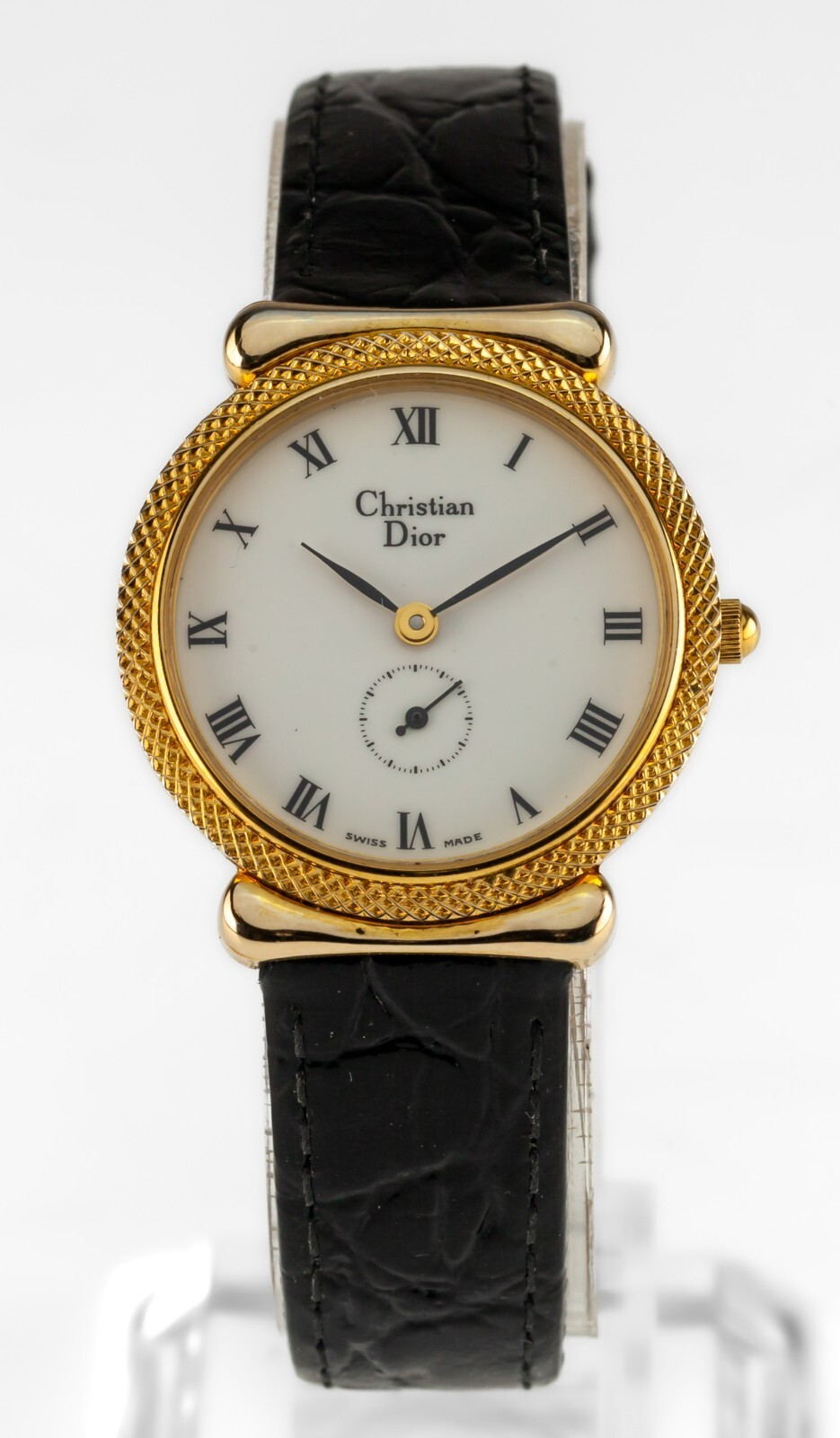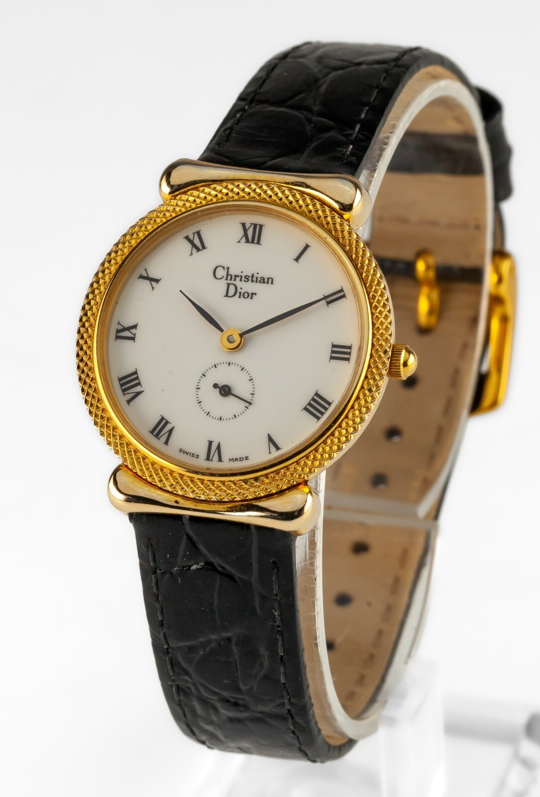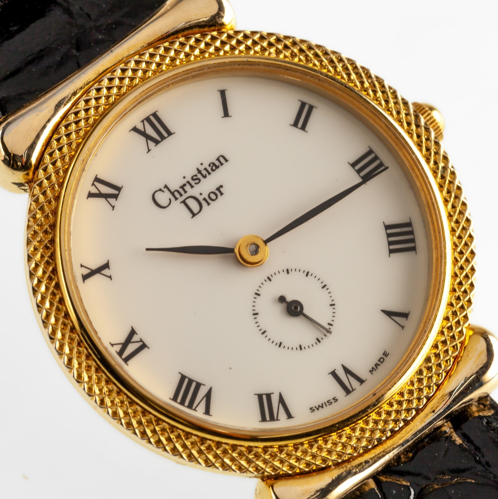 Orologio da quarzo per donne con oro oro vintage Dior con cinturino in pelle nera.