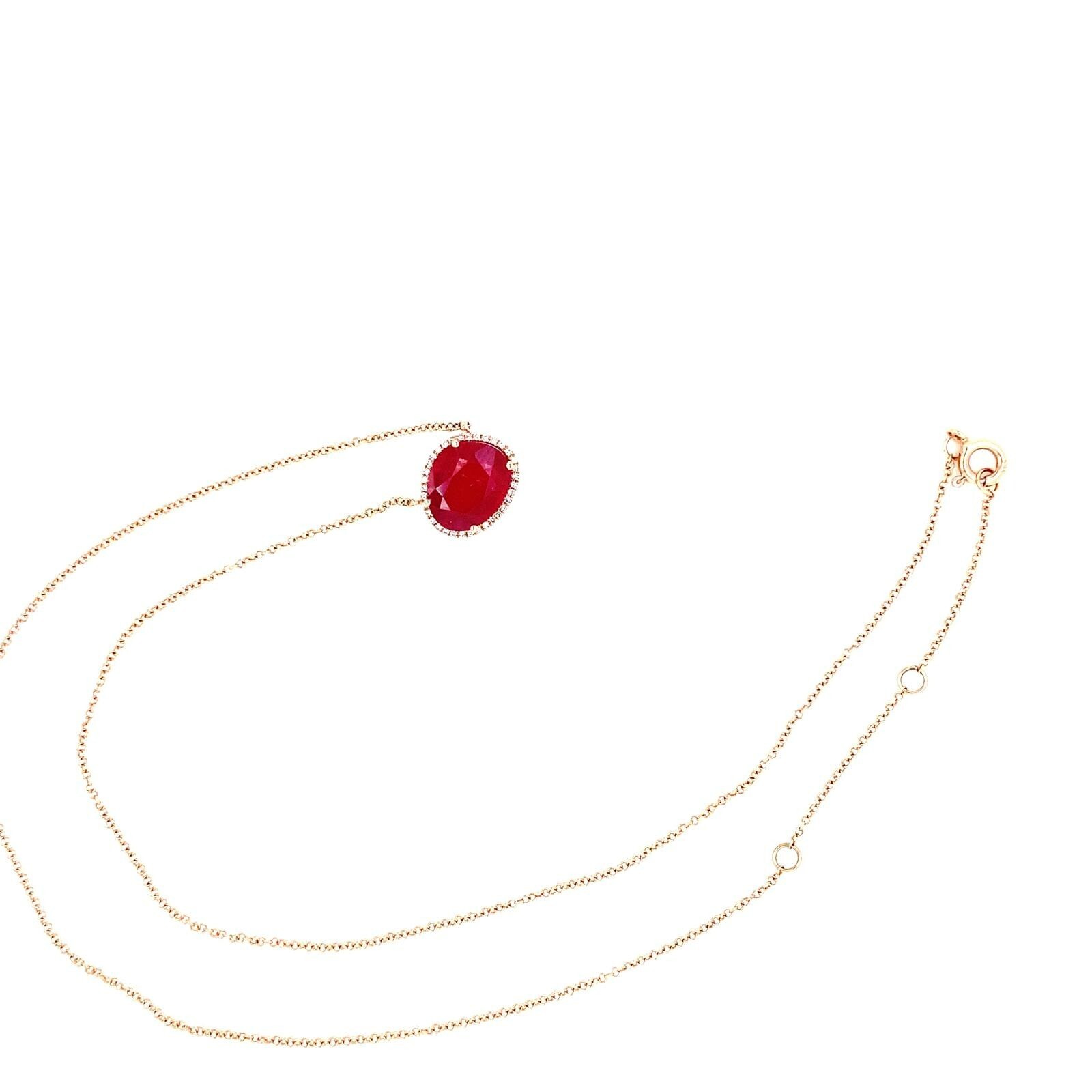 Features a centered ruby accented by diamonds mounted in a Rose Gold Chain