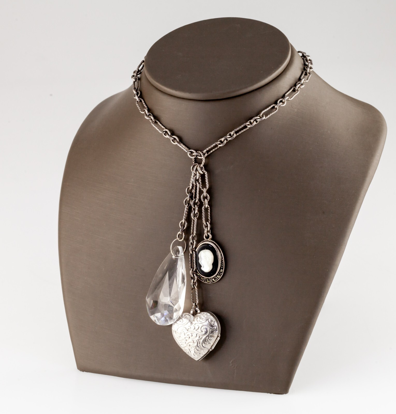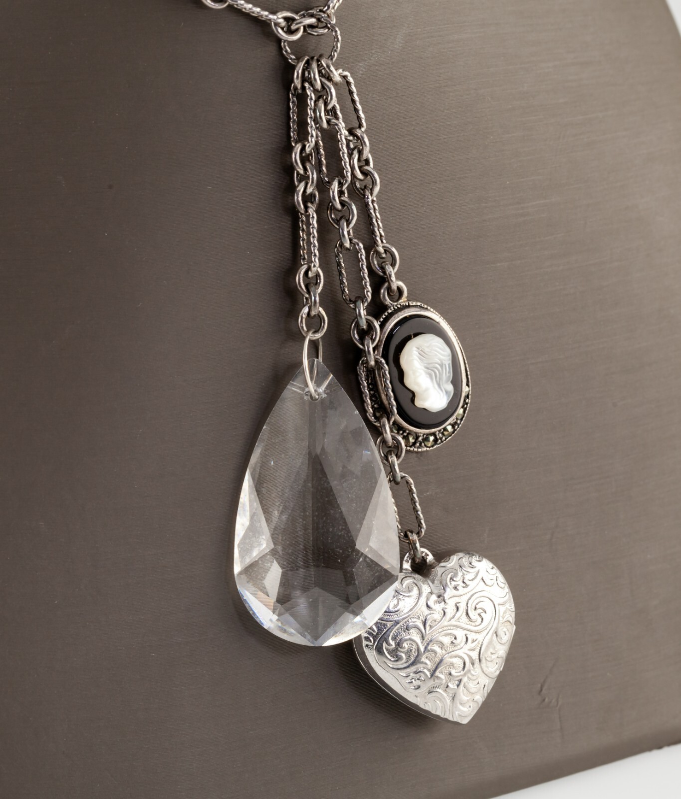 Features Silver Photo Locket, Simulated Briolette Crystal, and Mother of Pearl Cameo