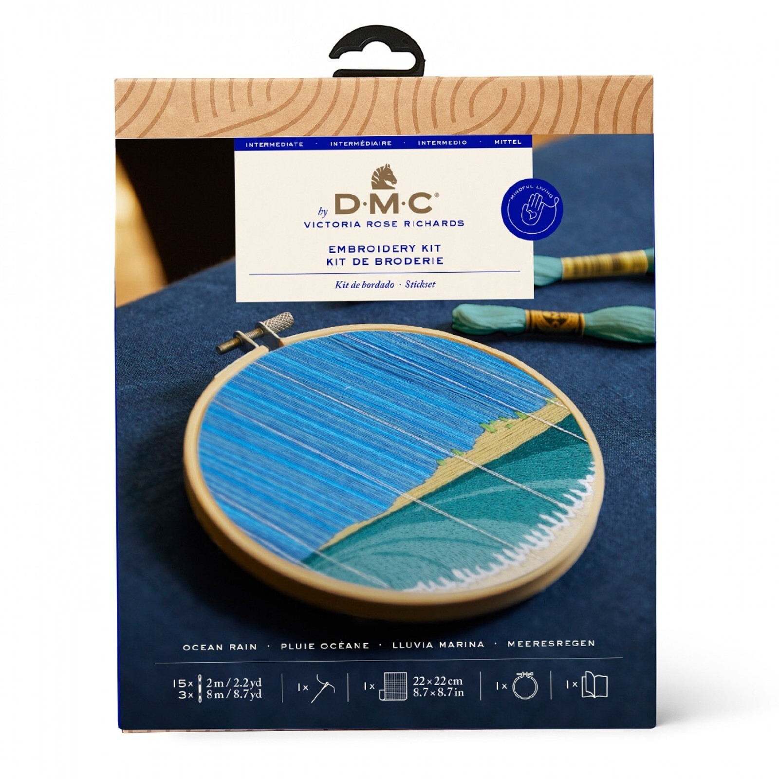 Taking its inspiration from the Devon landscape, this modern design by Victoria Rose Richards evokes a dramatic scene of rain falling into the sea in a semi-abstract way which is typical of her style. The kit includes everything you need to get stitching including DMC?s Six-Strand Embroidery Floss. Package Contains: 14 x Six-Strand Embroidery Floss 2 m / 2.2 yd skeins ? 100 percent cotton 3 x Six-Strand Embroidery Floss 8 m / 8.7 yd skeins ? 100 percent cotton 1 x Mouline Light Effects 2 m / 2.2 yd skein ? 100 percent polyester 1 x printed fabric 22 x 22 cm / 8.7 x 8.7 in ? 100 percent cotton 1 x hoop 12.5 cm / 4.9 in 1 x embroidery needle 1 x instructions EN / FR / SP / DE / IT / PT / NL / JA. Stitches Used: Satin Stitch, Stem Stitch, Long and Short Filling Stitch, Straight Stitch. De