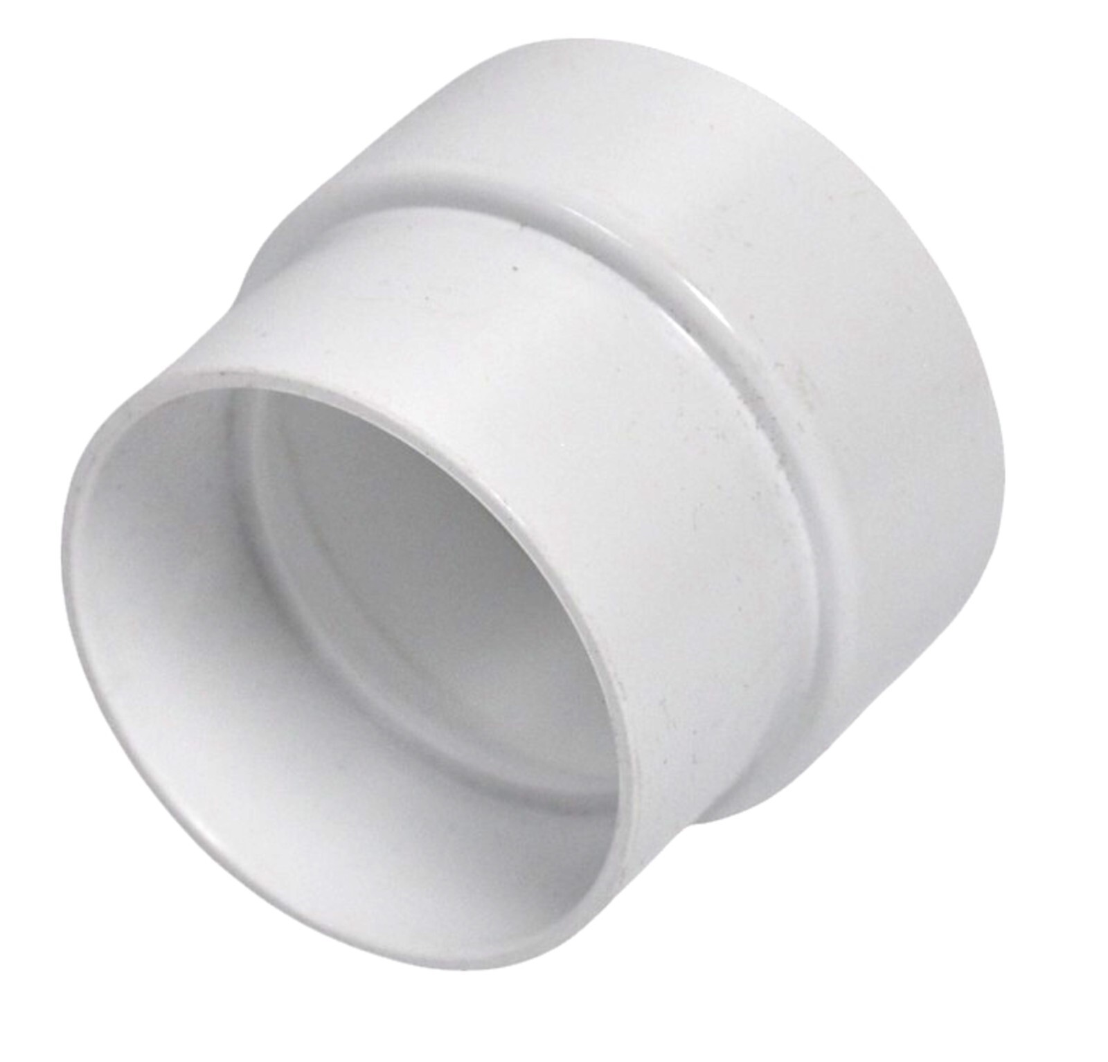 White pipe adaptor fitting 2 inches to 1-13/16 inches used in central vacuum installations.